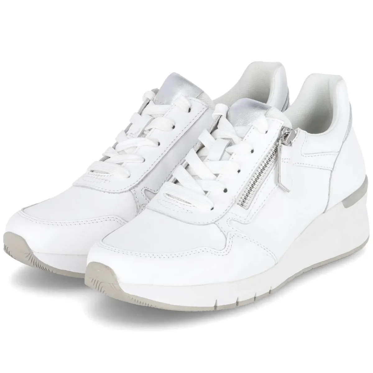 Der Low Sneaker von Gabor vereint klaren Look und Komfort in einem zeitlosen Design. Weiches, weißes Glattleder formt die runde Kappe und sorgt mit verstärkter Zehen- und Fersenpartie für langlebige Stabilität. Schnürung und seitlicher Reißverschluss erleichtern das An- und Ausziehen, während der leicht gepolsterte Einstieg und die synthetische Decksohle ein angenehmes Tragegefühl bieten. Das gepolsterte Wechselfußbett lässt sich bei Bedarf austauschen, die flexible, rutschhemmende Laufsohle gibt sicheren Halt auf urbanem Untergrund. Dezente, silberne Highlights und ein feines Branding runden den vielseitigen Auftritt ab. Die Passform fällt normal aus und begleitet zuverlässig durch Alltag und City. Modetipp: Zu verkürzten Straight-Jeans und cremefarbenem Trench entsteht ein cleaner City-Look; feine Ripp-Socken in Off-White setzen einen sportlichen Akzent.