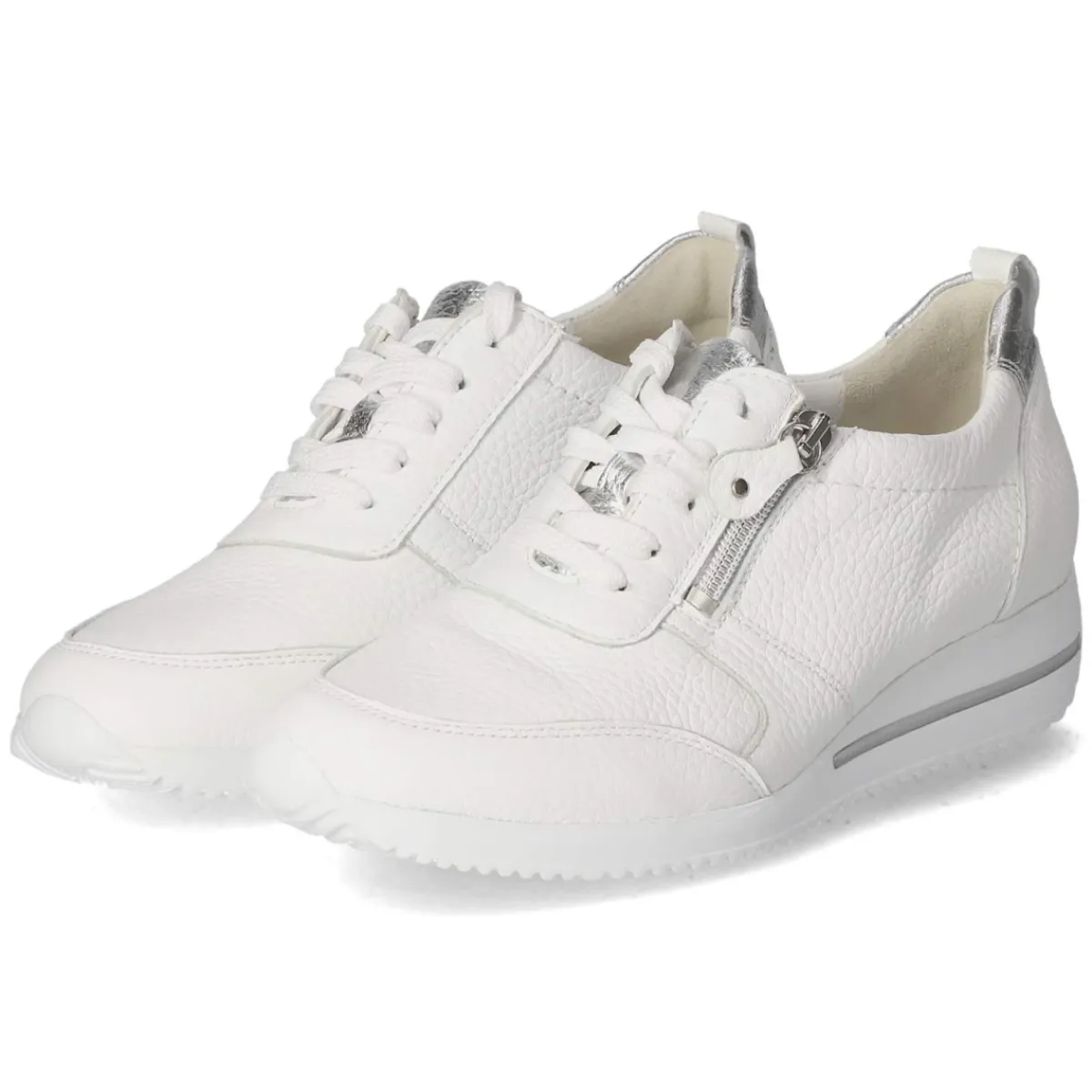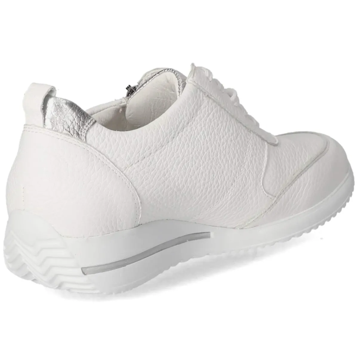 Der Low Sneaker HIMONA von Waldläufer präsentiert sich in klassischem Weiß und verbindet Komfort mit dezentem Glanz. Atmungsaktives Echtleder in glatter Ausführung umschließt den Fuß, die runde Spitze und verstärkte Zehen- und Fersenbereiche sorgen für Schutz und Formstabilität. Ein gepolsterter Einstieg und das weich dämpfende, herausnehmbare Fußbett entlasten bei jedem Schritt, die flexible Laufsohle unterstützt natürliches Abrollen. Dank Schnürung und zusätzlichem Reißverschluss gelingt das An- und Ausziehen schnell und passgenau; die Anziehlasche erleichtert den Griff. Silberfarbene Akzente setzen moderne Highlights. Die Lederdecksohle schmeichelt der Haut, der Größennote entsprechend fällt das Modell normal aus. Modetipp: Zu Cropped‑Jeans und einem lichtfarbenen Stricktop entsteht ein cleaner City‑Look; Accessoires mit silbernen Details greifen die Akzente stilvoll auf.