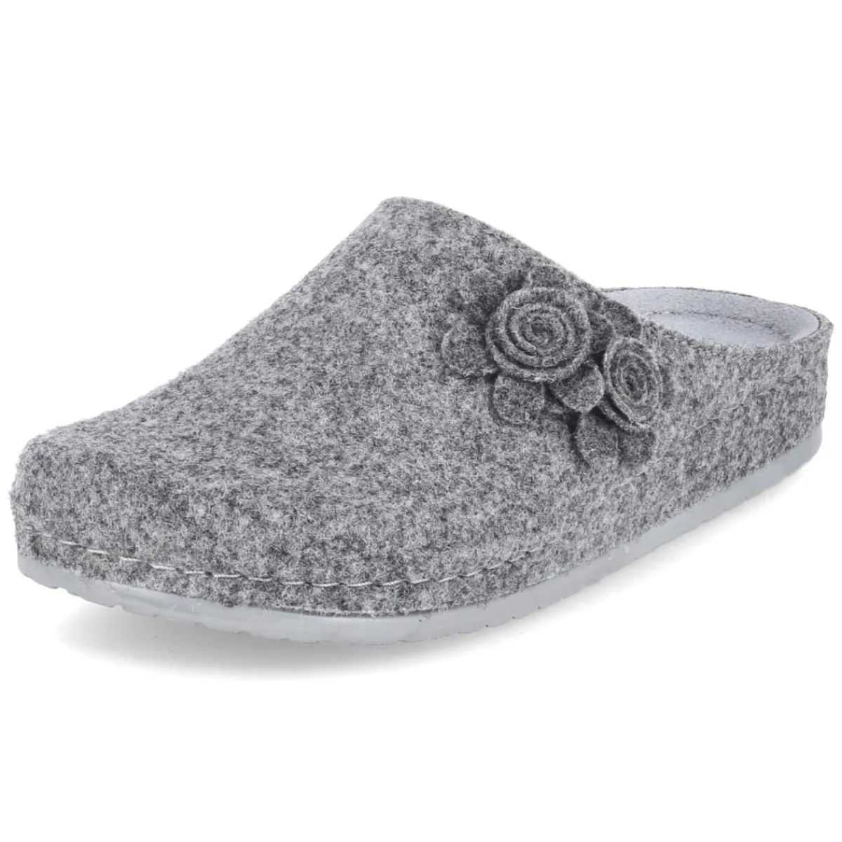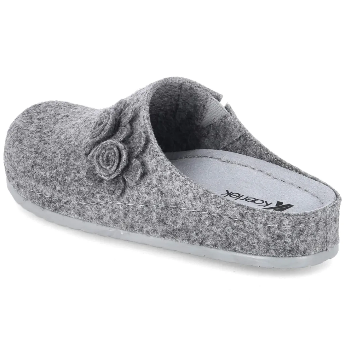 Kaerlek präsentiert mit den Pantoffeln NANA einen zeitlosen Hausschuh für Damen, der Komfort und dezente Eleganz vereint. Das melierte Obermaterial aus robust anmutendem Filz wirkt formstabil und anschmiegsam, während die klassische, runde Spitze die schlanke Silhouette unterstreicht. Eine seitliche, feine Rosenapplikation setzt einen femininen Akzent, der nie aufdringlich wirkt. Dank Elastikeinsatz am Spann gelingt das Hineinschlüpfen mühelos, die Passform bleibt angenehm sicher. Die vorgeformte, weich gepolsterte Lederdecksohle unterstützt den Fuß den ganzen Tag, die flexible Laufsohle sorgt für leises Abrollen auf glatten Böden. Das Modell fällt normal aus und überzeugt mit langlebiger Qualität für jeden Tag. Modetipp: Zu Strickhose und lockerem Cardigan in Graunuancen oder Rosétönen kombinieren – Ton-in-Ton entsteht ein harmonischer, gepflegter Lounge-Look.
