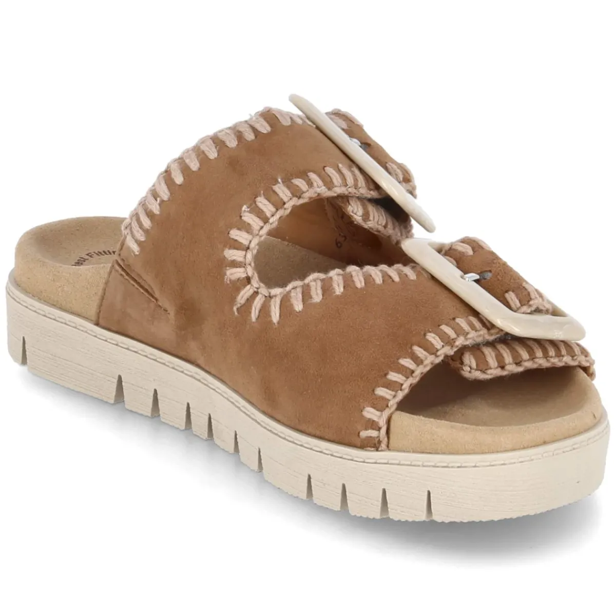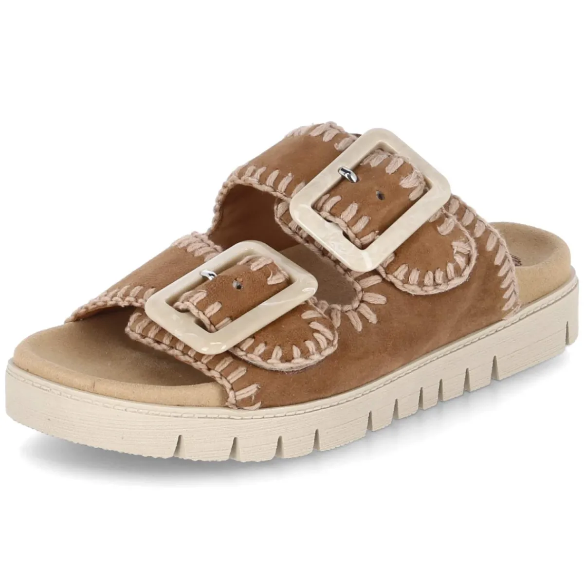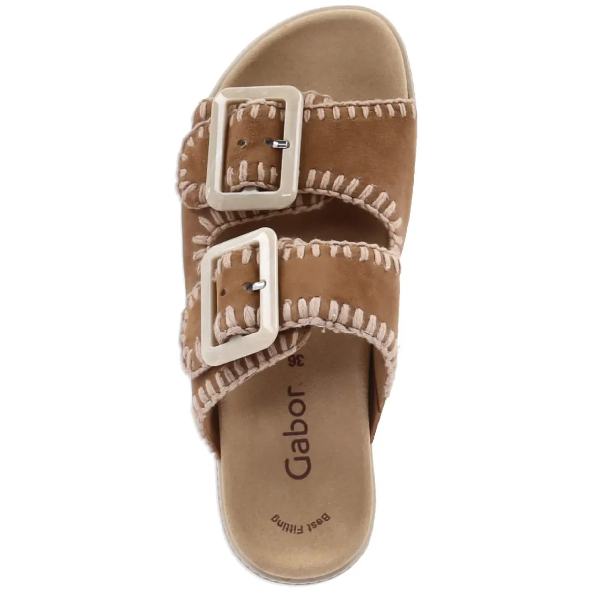 Diese Gabor Pantoletten vereinen lässige Natürlichkeit mit hohem Tragekomfort. Das braune Obermaterial aus langlebigem Rauleder verleiht einen warmen, authentischen Look, den markante, grobe Nähte und zwei verstellbare Klettriemen mit Zierschnallen stilsicher akzentuieren. Die offene Schuhspitze sorgt für Luftigkeit, während das vorgeformte, gepolsterte Tieffußbett mit textiler Decksohle die Füße angenehm umschließt. Eine flexible, rutschfeste Laufsohle bietet sicheren Halt im Alltag, vom Stadtbummel bis zur Gartenterrasse. Die Passform fällt normal aus und macht das Anziehen unkompliziert. Modetipp: Zu einem Midi-Jeansrock, einer leichten Leinenbluse und einer Basttasche entsteht ein entspannter Sommer-Look, der die natürliche Braunnuance besonders schön hervorhebt.