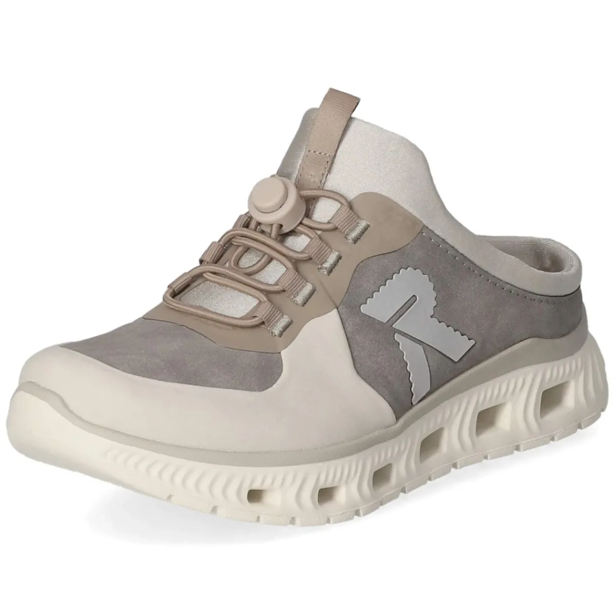 Die grauen Pantoletten von Rieker verbinden modernes Design mit durchdachter Funktion. Das Obermaterial aus Textil und Synthetik wirkt zeitgemäß und pflegeleicht, die modern designte Synthetik setzt dezente Akzente. Für einen unkomplizierten Einstieg sorgt ein Elastikband mit Schnellverschluss, das den Sitz bequem stabilisiert. Die beste Memory-Foam-Fußbettung schmiegt sich weich an und federt Schritte souverän ab, während die textile Decksohle angenehm am Fuß liegt. Runde Schuhspitze und verstärkter Zehenbereich erhöhen den Komfort im Alltag. Eine flexible, rutschhemmende Laufsohle bietet Trittsicherheit auf unterschiedlichen Untergründen, reflektierende Details verbessern die Sichtbarkeit bei wenig Licht. Der Schnitt fällt normal aus und macht das Finden der passenden Größe leicht. Modetipp: Besonders stimmig zu Cropped-Jeans in Hellblau und einem melierten Stricktop oder als Ton-in-Ton-Partner zu grauen Leinenhosen.