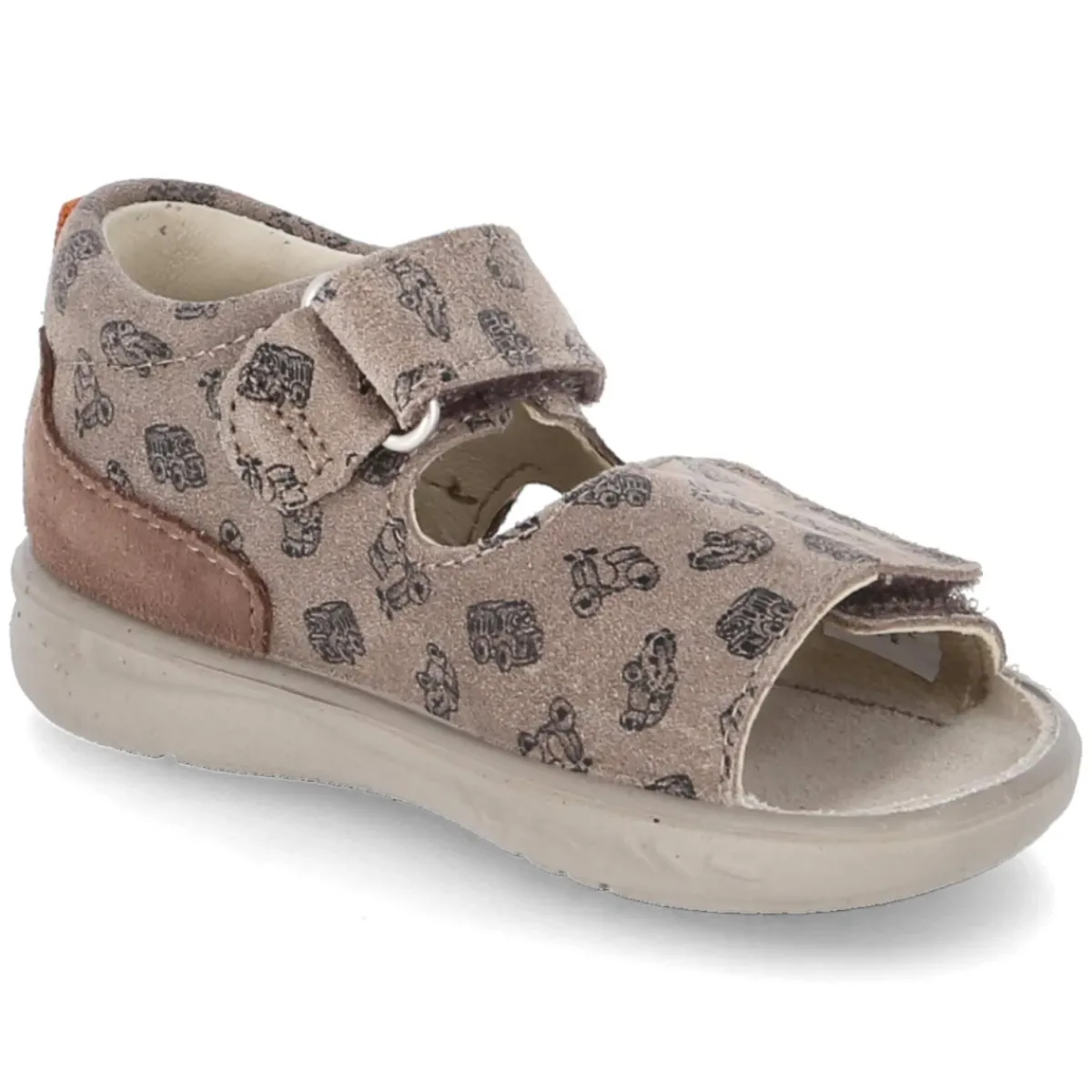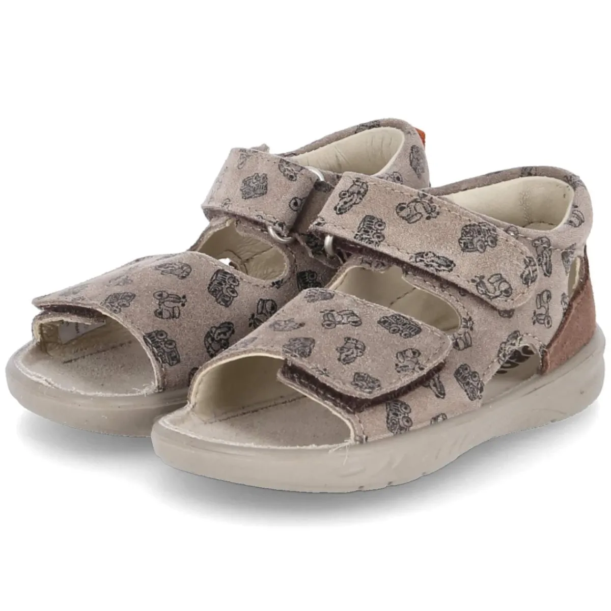 Die Sandale BANU von Pepino vereint langlebiges Echtleder mit kindgerechtem Komfort. Weiches Rauleder in warmem Braun schmiegt sich an den Fuß, während die hautfreundliche Lederdecksohle ein angenehmes Klima bewahrt. Zwei praktische Klettverschlüsse erleichtern das Hineinschlüpfen und sorgen für einen sicheren, individuell regulierbaren Sitz. Der verspielte Print mit verschiedenen Fahrzeugen setzt einen fröhlichen Akzent, der Kleinkindern Freude macht. Eine verstärkte Ferse und ein gepolsterter Einstieg bieten Halt und Bequemlichkeit bei jedem Schritt. Die offene Schuhspitze und die flexible, rutschhemmende Laufsohle unterstützen natürliche Bewegungen auf wechselndem Untergrund. Dank normaler Passform fällt die Größenwahl leicht, sodass der Alltag unbeschwert starten kann. Modetipp: Zu Leinen-Shorts und gestreiftem T-Shirt entsteht ein sommerlicher Look, den ein braunes Cap oder ein leichter Sonnenhut harmonisch ergänzt.