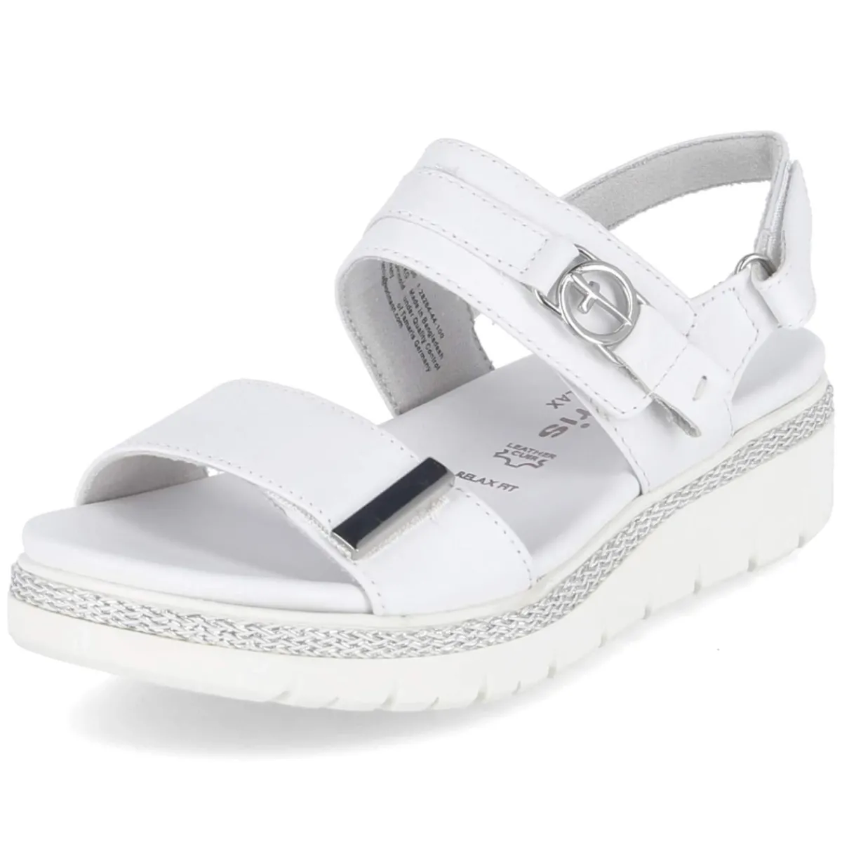 Zeitlos und edel präsentiert sich diese Damen-Sandale von Tamaris in klarem Weiß. Langlebiges Echtleder in glatter Ausführung umschmeichelt den Fuß, während die offene Spitze luftige Leichtigkeit verspricht. Praktische Klettverschlüsse erlauben eine passgenaue Regulierung, das weich gepolsterte, wechselbare Fußbett entlastet bei jedem Schritt. Eine Decksohle aus Leder sorgt für ein angenehmes Klima, die flexible, rutschfeste Laufsohle unterstützt sicheren Halt auf unterschiedlichen Untergründen. Der silbern beflochtene, obere Sohlenrahmen setzt einen raffinierten Akzent, der schlichte Looks subtil aufwertet. Die Passform fällt normal aus und macht die Auswahl unkompliziert. Ein vielseitiger Begleiter für Alltag und Freizeit, der Komfort und Stil selbstverständlich verbindet. Modetipp: Zu einem weißen Leinenkleid und filigranem Silberschmuck kombinieren, um den Rahmen elegant aufzugreifen.