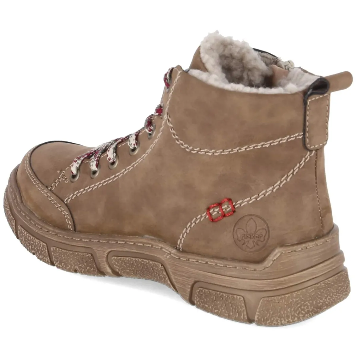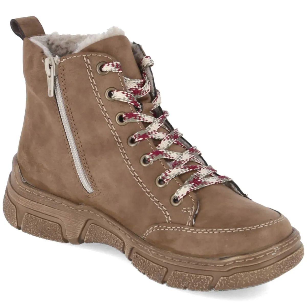 Der braune Damen-Schnürboot von Rieker vereint behagliche Wärme mit unkomplizierter Alltagstauglichkeit. Das pflegeleichte Kunstleder zeigt eine ebenmäßige Oberfläche, die sich leicht reinigen lässt, während das üppige Teddyfutter an kalten Tagen zuverlässig wärmt. Dank Kombination aus Schnürsenkeln und seitlichem Reißverschluss gelingt das An- und Ausziehen besonders komfortabel, unterstützt durch Anziehlasche und weich gepolsterten Einstieg. Der runde Leisten bietet Zehenfreiheit, der verstärkte Fersen- und Zehenbereich sorgt für Formstabilität. Ein gepolstertes, herausnehmbares Fußbett und eine Textil-Decksohle erhöhen den Tragekomfort, die Passform fällt normal aus. Ein vielseitiger Winterbegleiter, der urbanen Look und Komfort verbindet. Modetipp: Zu Strickkleid und grobem Wollmantel entsteht ein harmonischer Kontrast; schlanke Jeans und ein Schal in Naturtönen betonen die warme Braunnuance besonders schön.