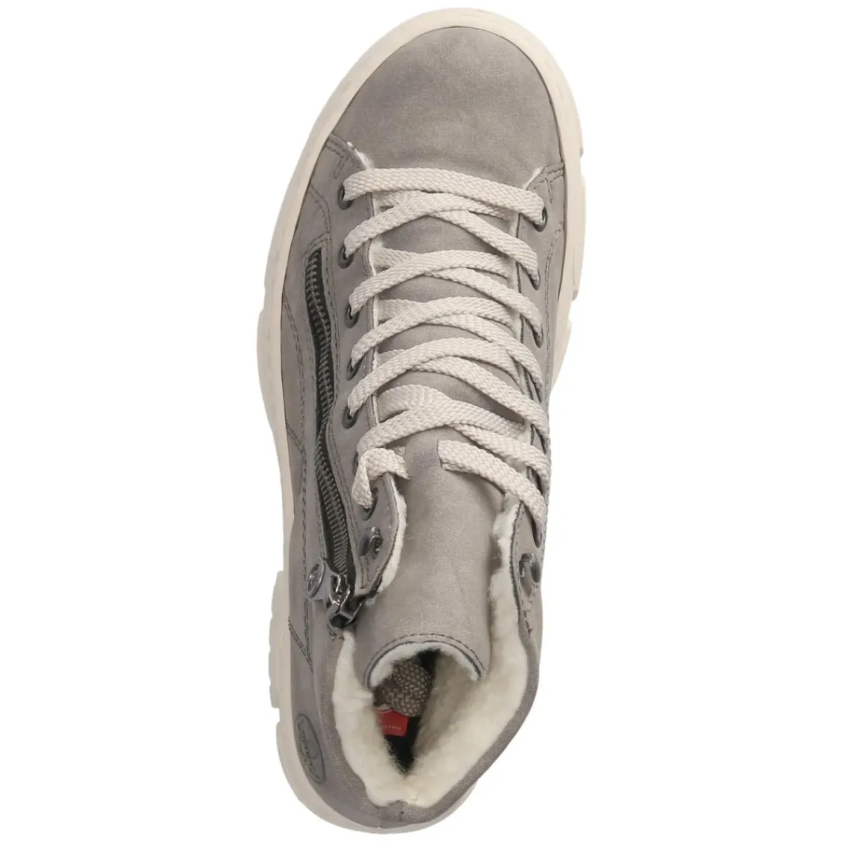 Diese grauen Schnürstiefeletten von Rieker vereinen urbane Lässigkeit mit durchdachter Funktion. Das Obermaterial aus robuster Synthetik zeigt sich pflegeleicht und formstabil, die runde Spitze sorgt für angenehme Zehenfreiheit. Ein 4,5 cm hoher Plateauabsatz bringt sanfte Höhe und dämpft Schritte, während das leichte Warmfutter für behagliches Klima an kühlen Tagen steht. Die Kombination aus Schnürsenkeln und zusätzlichem Reißverschluss erleichtert den Einstieg und bietet variablen Halt. Ein herausnehmbares Fußbett erhöht den Komfort und lässt sich bei Bedarf austauschen. Geometrische Ziernähte und feine Markendetails setzen moderne Akzente, die leichte Profilsohle gibt verlässlichen Grip. Der Größenhinweis fällt normal aus, was die Auswahl unkompliziert macht. Modetipp: Mit Straight-Leg-Jeans, geripptem Rollkragen in Creme und einem grauen Wollmantel entsteht ein monochromer City-Look; ein Schal in Beerentönen setzt einen eleganten Farbakzent.