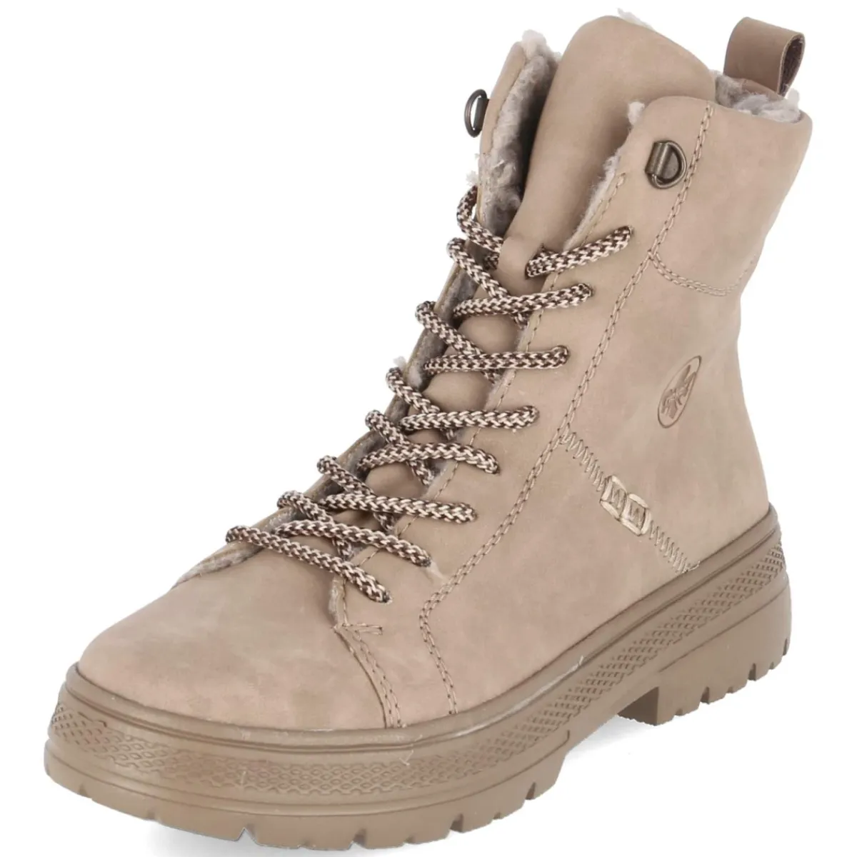 Der Winterboot von Rieker verbindet kuscheligen Komfort mit alltagstauglicher Funktion. Das Obermaterial aus pflegeleichtem Kunstleder zeigt sich in softem Beige und lässt sich mühelos reinigen, während Warm- und Teddyfutter für wohlige Wärme sorgen. Ein leicht gepolsterter Einstieg, die runde Spitze und das relaxtes Leichtgewicht-Gefühl schenken langanhaltenden Tragekomfort. Praktisch: Schnürsenkel und seitlicher Reißverschluss ermöglichen ein unkompliziertes An- und Ausziehen, die Anziehlasche unterstützt dabei. Die flexible Profilsohle bietet zuverlässigen Grip auf winterlichen Wegen. Das komfortable Wechselfußbett mit Textil-Decksohle kann bei Bedarf gegen eigene Einlagen getauscht werden. Der Schnitt fällt normal aus und trifft den Geschmack erwachsener Trägerinnen, die Wert auf Bequemlichkeit legen. Modetipp: Zu Strickkleid, dicker Strumpfhose und langem Wollmantel entsteht ein warmer, harmonischer Ton-in-Ton-Look.