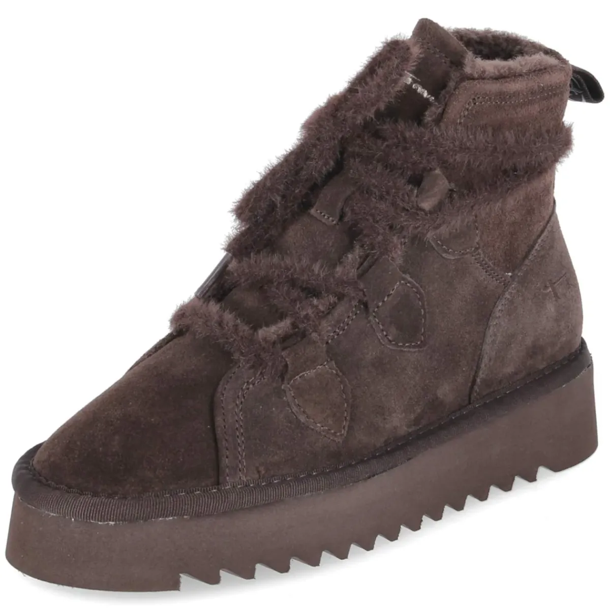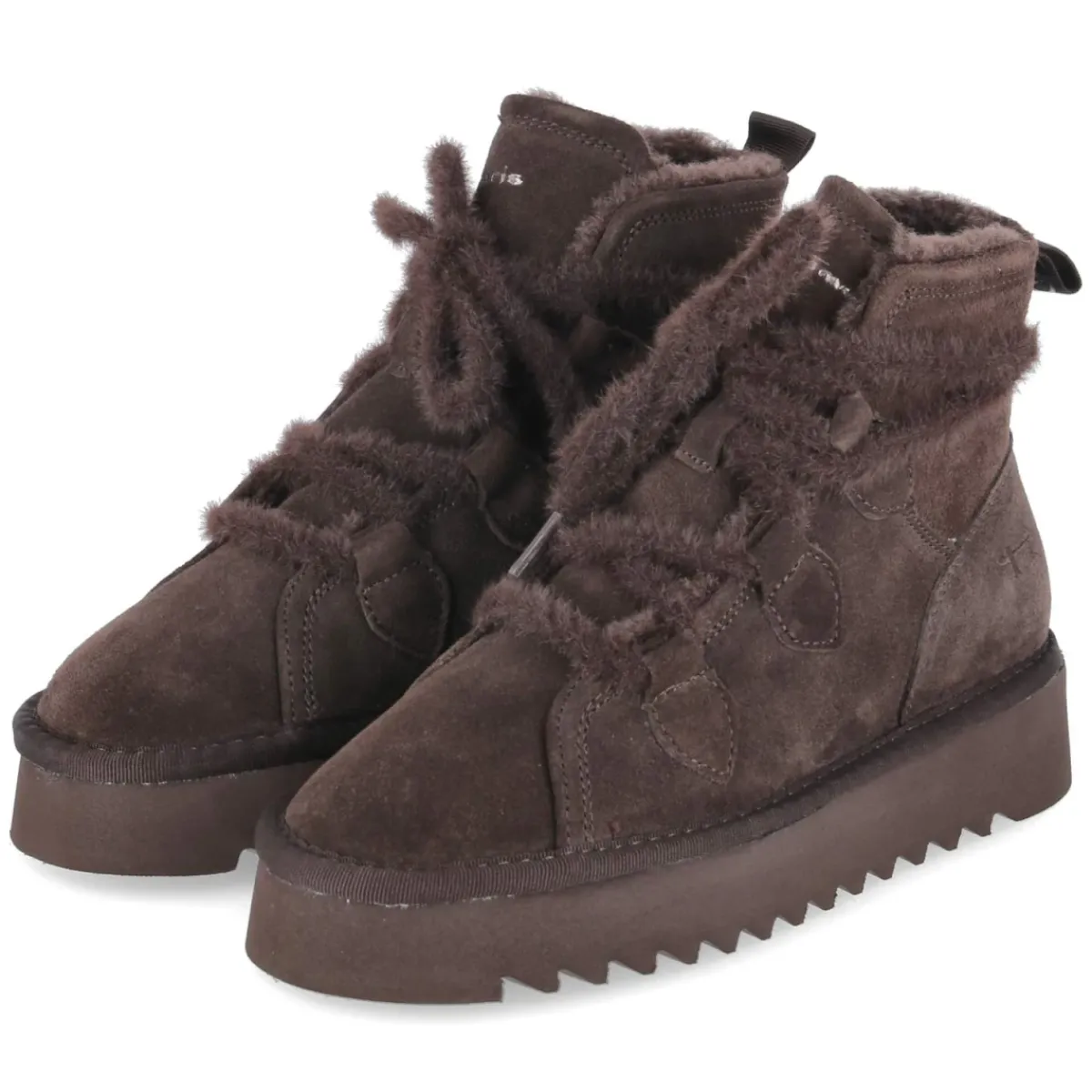 Die Winterboots von Tamaris vereinen robuste Funktion und feminine Lässigkeit: Rauleder aus langlebigem Echtleder in warmem Braun trifft auf eine dunkelbraune Plateausohle mit leichtem Profil. Das Modell fällt normal aus, die runde Spitze und die verstärkte Ferse sorgen für angenehme Stabilität, während flauschige Schnürsenkel den Look abrunden. Innen hält ein Warmfutter die Füße bei kalten Tagen behaglich, unterstützt von einer textilen Decksohle und einem weich gepolsterten Fußbett. Trotz solider Verarbeitung bleibt der Schuh ein relaxtes Leichtgewicht; die 3,5‑cm-Plateauhöhe streckt dezent und bietet Komfort im Alltag. Modetipp: mit kuscheligem Strickkleid, Wollmantel und grober Rippstrumpfhose kombinieren – dazu eine Crossbody-Bag in Cognac und Ton-in-Ton-Handschuhe.