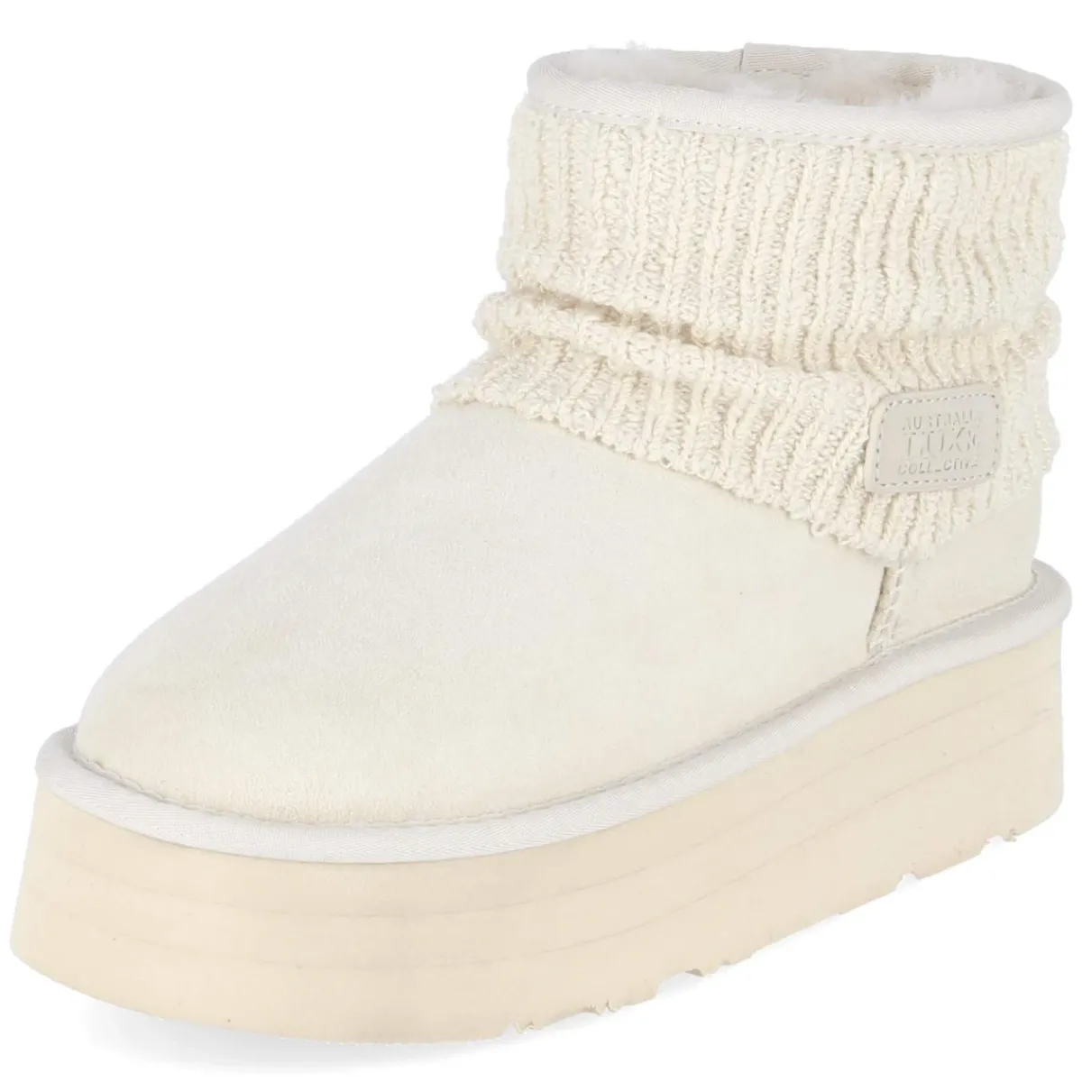 Winterboots FAME von Australia Luxe vereinen urbane Modernität mit kuscheliger Wärme. Das weiße Obermaterial aus Leder und Textil setzt mit markanten Nähten ein klares Statement, während das warme Lammfellfutter und die textile Decksohle für behaglichen Komfort sorgen. Die runde Spitze und der unkomplizierte Einstieg ohne Verschluss unterstreichen den lässigen Charakter, die verstärkte Ferse mit Metall-Label verleiht eine edle Note. Der gepolsterte Einstieg mit Umschlagkrempe in Strickoptik und Lederpatch schmiegt sich weich an, die leichte, starke Plateausohle mit 4,5 cm Höhe streckt subtil und bietet verlässlichen Grip. Fällt normal aus und überzeugt mit robustem Material-Mix und moderner Optik – ideal für kalte Tage in der City. Modetipp: Ton-in-Ton mit Creme, Grau und Weiß stylen, dazu chunky Socken leicht sichtbar, langer Wollmantel und silberne Akzente für einen klaren, winterlichen Look.