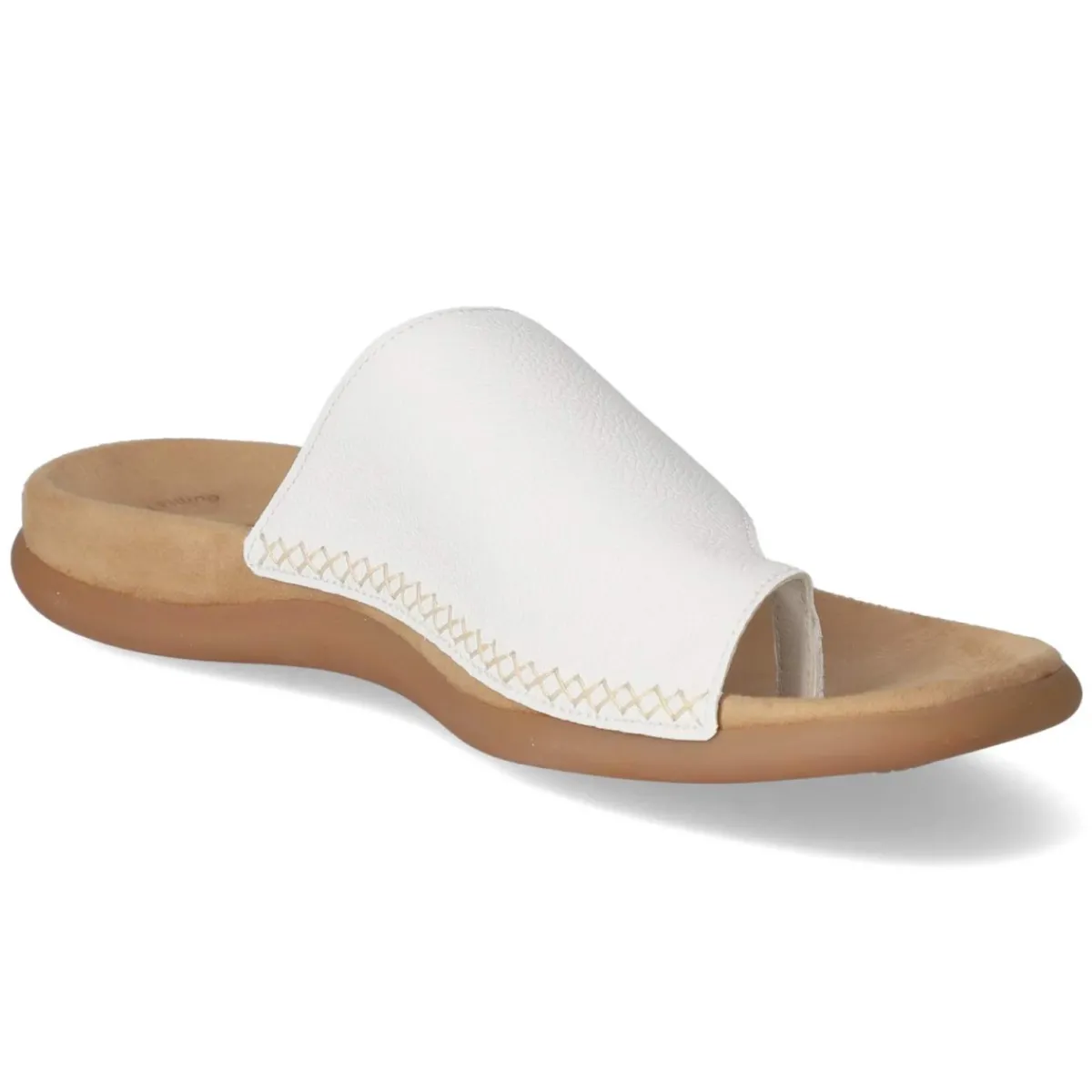 Gabor präsentiert einen puristischen Zehentrenner in zeitlosem Weiß, der mit reduziertem Design und durchdachter Funktion überzeugt. Das Obermaterial aus langlebigem Echtleder in glatter Ausführung fühlt sich angenehm an und gewinnt mit jedem Tragen an Charakter. Eine vorgeformte Decksohle aus Textil und das dämpfende Fußbett sorgen für entspannten Komfort, während die flexible Laufsohle mit Grip sicheren Halt bietet. Die offene Schuhspitze unterstreicht den luftigen Look, die verschlusslose Konstruktion ermöglicht unkompliziertes Hineinschlüpfen. Ein seitlich gesetzter, zierender Kreuzstich verleiht feine Handwerks-Note. Dank normaler Passform fällt das Modell größengetreu aus und bietet vielseitige Kombinationsmöglichkeiten von Freizeit bis City. Modetipp: Besonders stimmig zu Leinenhosen, einem schlichten Hemdkleid oder Denim-Shorts; eine Korbtasche und filigraner Schmuck runden den Look sommerlich ab.