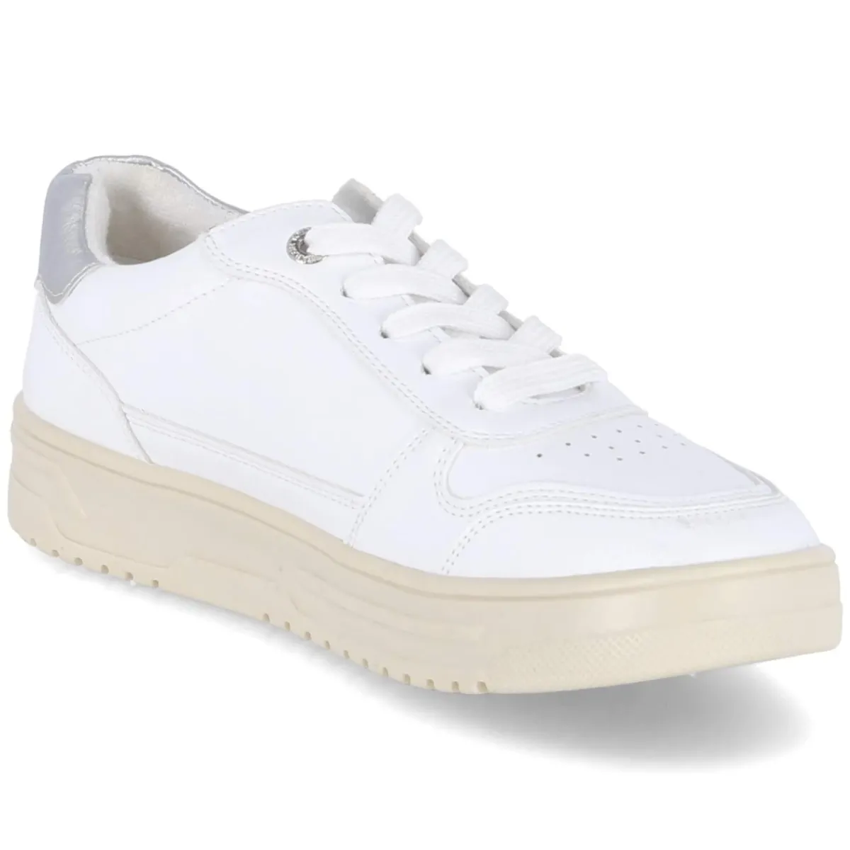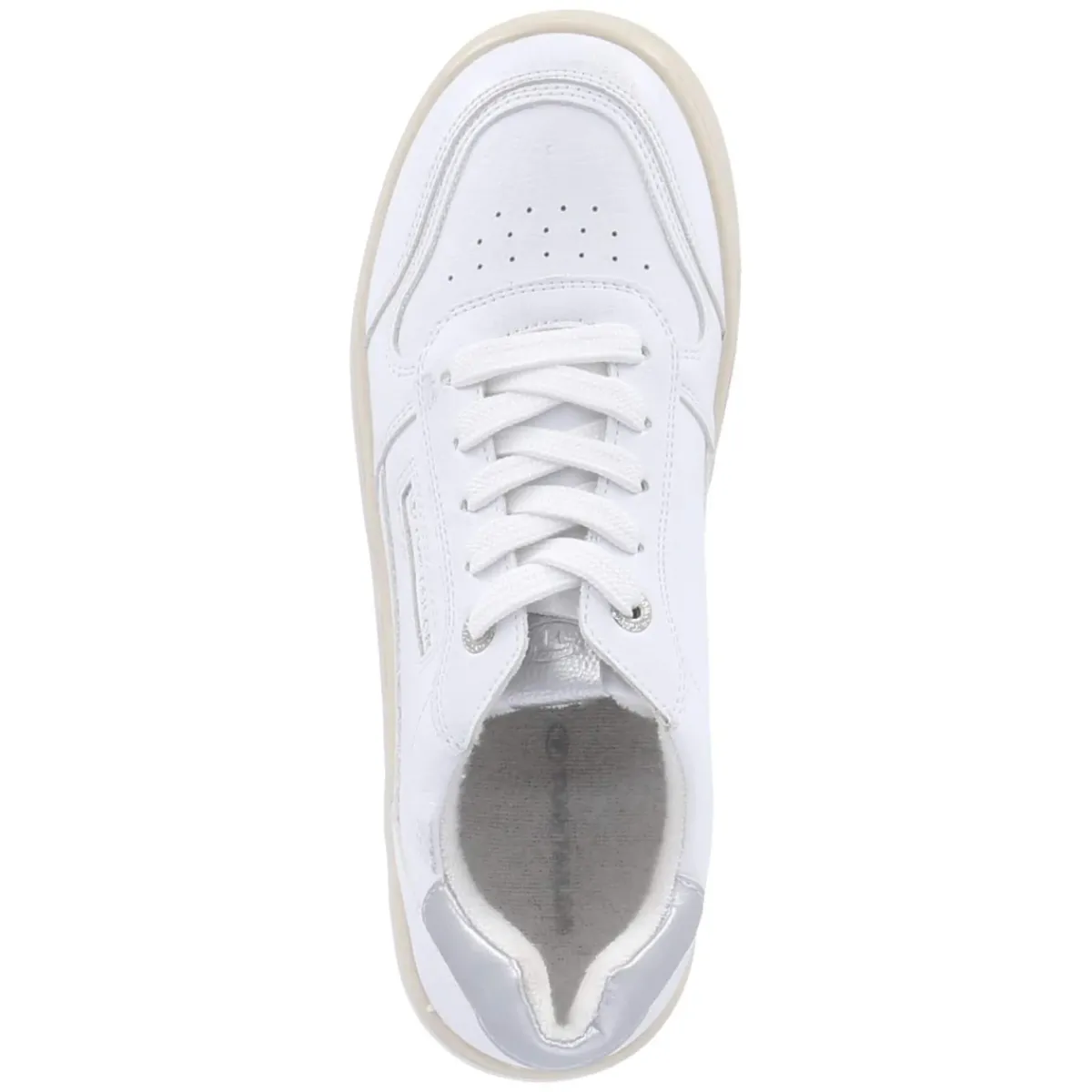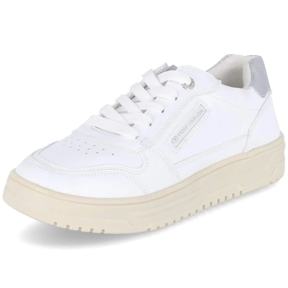 Puristisches Design trifft auf komfortstarke Details: Der weiße Low Sneaker von Tom Tailor für Damen überzeugt mit pflegeleichter Synthetik-Oberfläche und fein gelochtem Schuhdeck, das dem cleanen Look frische Leichtigkeit verleiht. Die runde Schuhspitze und der leicht gepolsterte Einstieg sorgen gemeinsam mit dem verstärkten Fersenbereich für angenehmen Halt. Innen bietet ein textiles Futter behagliches Klima, während das herausnehmbare Memory-Foam-Wechselfußbett die Schritte sanft abfedert. Eine flexible, rutschhemmende Cupsohle macht ihn zum verlässlichen Alltagsbegleiter. Silbern glänzende Highlights und dezente Markendetails setzen moderne Akzente. Der Schnitt fällt normal aus und lässt sich mühelos kombinieren – vom City-Trip bis zum Casual Friday. Modetipp: Mit Cropped-Jeans, gestreiftem Shirt und leichtem Trench entsteht ein zeitloser, urbaner Look.