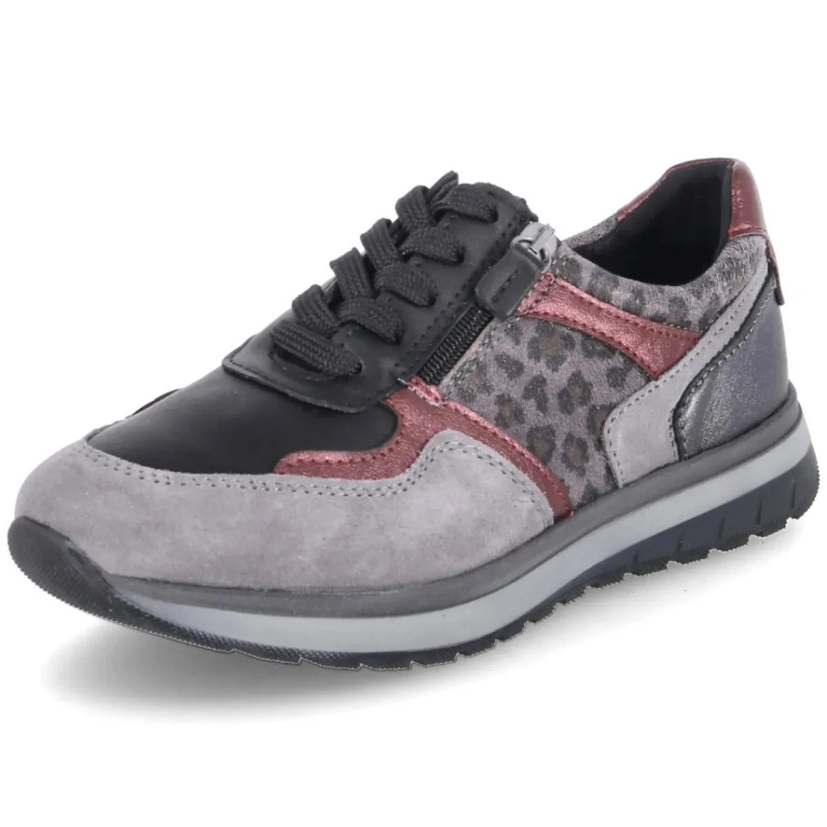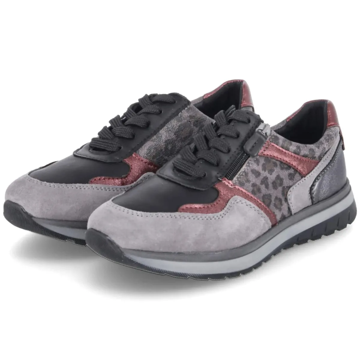 Der Low Sneaker VIVIAN 06 von Beliana vereint urbanen Chic und Komfort in einer zeitlosen Silhouette. Graues Leder in stilvollem Ledermix trifft auf weinrote Highlights und dezente Teile im Animal Print (Leopard), wodurch ein modisches Design mit subtiler Raffinesse entsteht. Die runde Schuhspitze und die flexible, griffige Laufsohle sorgen für angenehmes Auftreten im Alltag, während die verstärkte Zehen- und Fersenpartie zusätzliche Stabilität bietet. Praktisch: der Mix aus Schnürsenkeln und Reißverschluss ermöglicht schnelles An- und Ausziehen. Die Lederdecksohle sowie das Wechselfußbett unterstreichen den hohen Tragekomfort. Der Schnitt fällt normal aus und passt damit zuverlässig zur gewohnten Größe. Modetipp: Besonders stimmig zu Straight-Leg-Jeans in Dunkelblau und einem melierten Wollmantel; dazu eine bordeauxfarbene Crossbody-Bag, die die Akzente aufgreift.