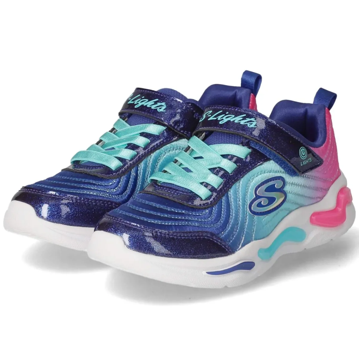 Der Low Sneaker WAVY BEAMS von Skechers setzt in leuchtendem Blau ein funkelndes Statement am Kinderfuß. Das Obermaterial aus Textil und Synthetik zeigt ein Wellenmuster mit Glitzer, ergänzt durch Teile in Lackoptik, während eine elegant schimmernde Oberfläche für einen besonders edlen Look sorgt. Der runde Zuschnitt bietet Zehenfreiheit, ein bequemes Fersenpolster sowie ein weich gepolstertes Fußbett und ein leicht gepolsterter Einstieg erhöhen den Tragekomfort im Alltag. Dank Klettverschluss mit praktischer Anziehlasche ist schnelles Reinschlüpfen problemlos, die blinkenden LEDs lassen sich per On/Off-Funktion steuern. Die flexible Non-Marking Laufsohle schont Hallenböden und gibt verlässlichen Grip, die Textil-Decksohle sorgt für angenehmes Fußklima. Mit Markendetails abgerundet und in der Größe normal ausfallend, passt der Sneaker unkompliziert. Modetipp: Zu Denim-Shorts oder Jeans, sportlichem Hoodie und farblich passenden Socken wird der Look zum strahlenden Lieblingsoutfit.