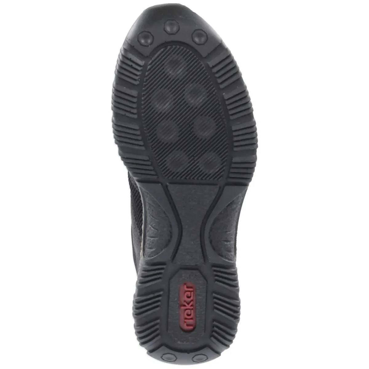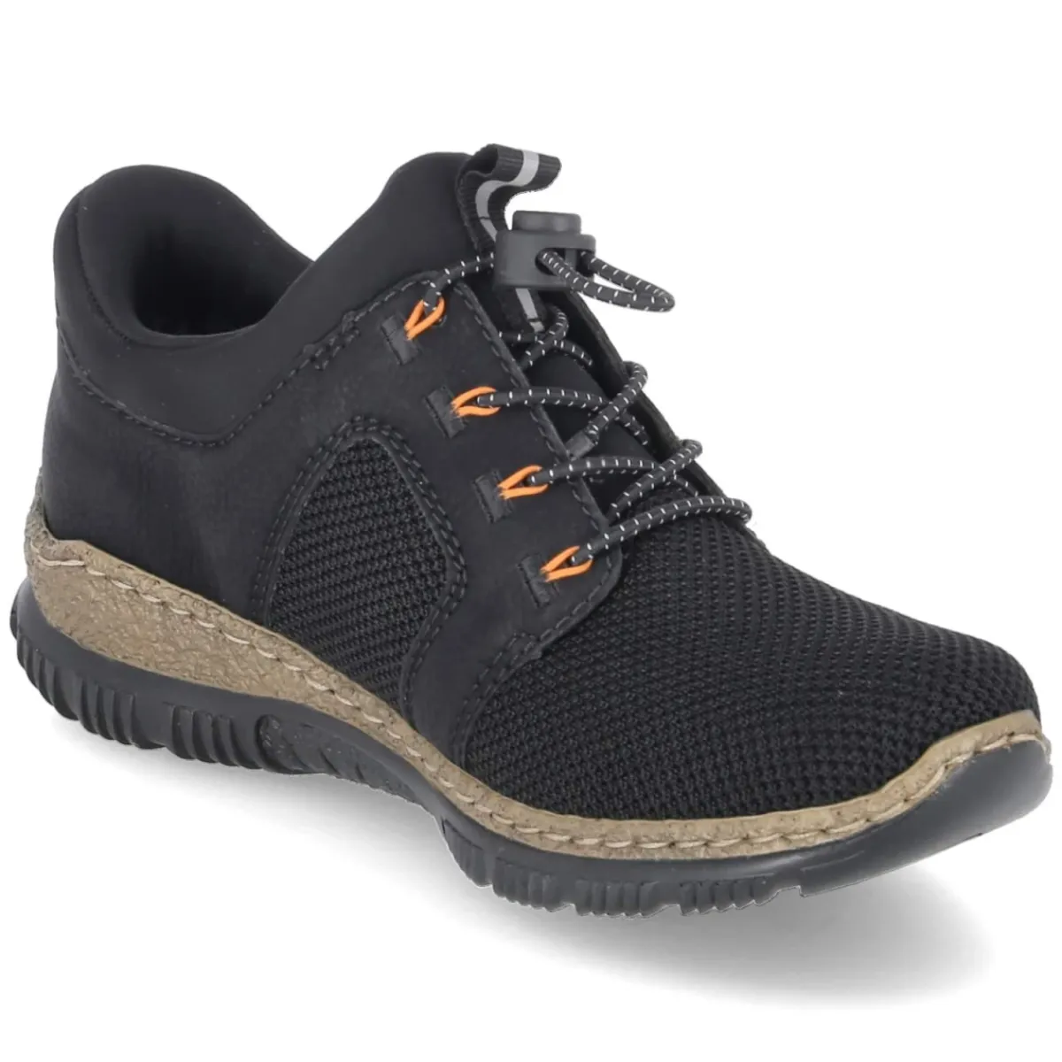 Der Low Sneaker von Rieker für Damen setzt auf einen modernen Material-Mix aus Textil und Synthetik in tiefem Schwarz und verbindet stilbewusste Optik mit maximaler Bequemlichkeit. Das Vorderteil in Feinstrickoptik schmiegt sich an, während ein Elastikband in Schnüroptik und der praktische Schnellverschluss für mühelosen Halt sorgen. Der weiche Einstieg und der verstärkte Fersenbereich geben angenehm sicheren Support. Dank Memory-Foam-Fußbett wird jeder Schritt weich abgefedert, die flexible, rutschhemmende Laufsohle vermittelt Standfestigkeit und das relaxt leichte Tragegefühl macht lange Tage spielend mit. Eine Anziehlasche mit Reflektorstreifen erhöht die Sichtbarkeit, die runde Spitze und die normale Passform bieten zeitlosen Komfort. Modetipp: Zu Cropped-Jeans und Oversize-Blazer entsteht ein lässig-eleganter City-Look.