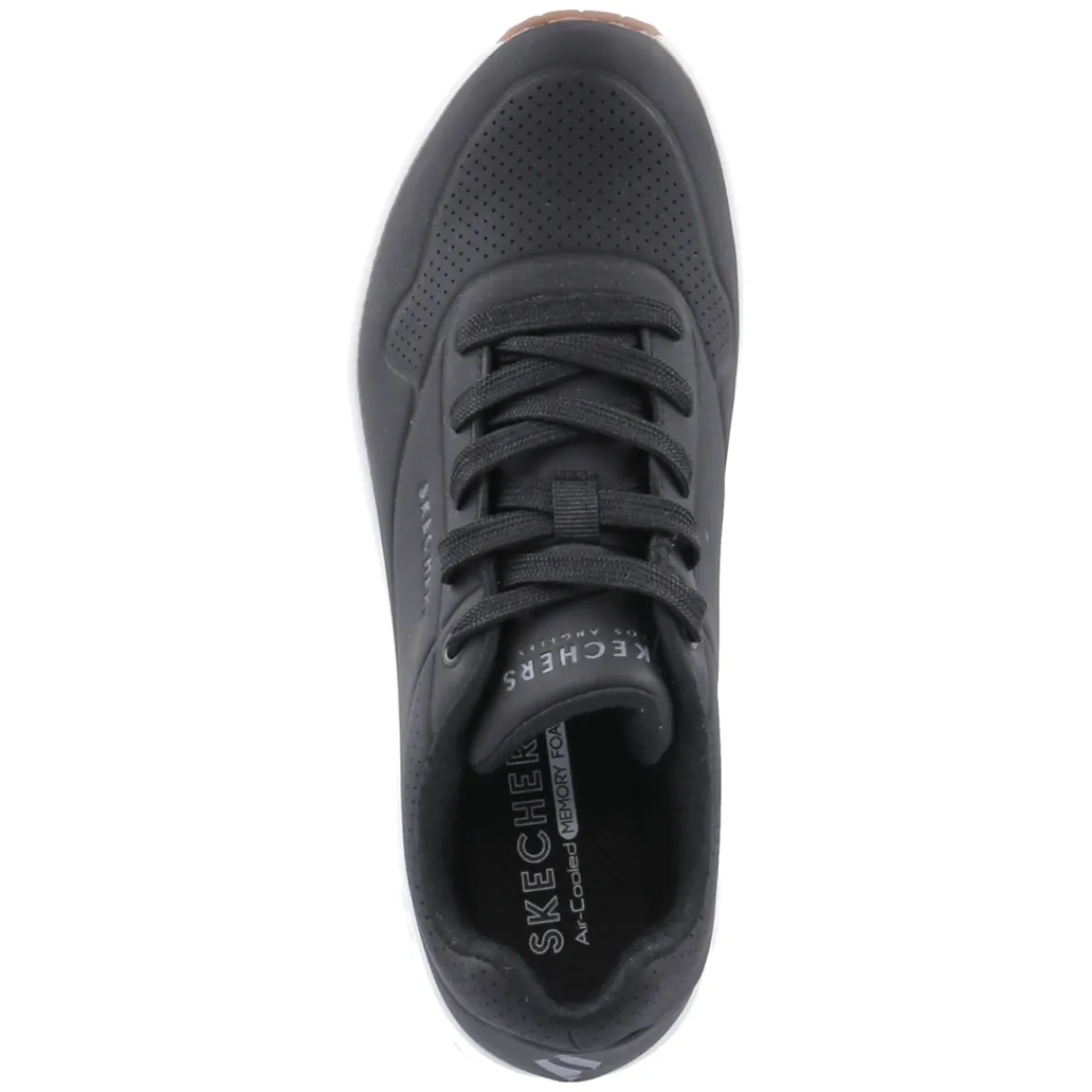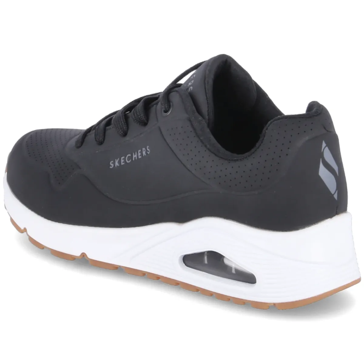 Der Low Sneaker STAND ON AIR von Skechers präsentiert sich in klassischem Schwarz und setzt mit modern designter Synthetik ein sportlich-elegantes Statement. Das Obermaterial zeigt dynamische Streifen-Prägungen, während gelochter Schuhdeck und perforierter Schaftrand für atmungsaktive Leichtigkeit sorgen. Die runde Spitze und der gepolsterte Einstieg sichern entspanntes Tragen im Alltag. Herzstück ist die beste Memory-Foam-Fußbettung, die jeden Schritt weich abfedert. Eine flexible, rutschhemmende Laufsohle gibt verlässlichen Halt, die Schnürung ermöglicht passgenaue Anpassung. Der Größenhinweis fällt normal aus und macht die Wahl unkompliziert. Modetipp: Zum cleanen Athleisure-Look mit Cropped-Jeans, weißem Oversize-Shirt und Trench kombinieren, dazu feine Silber-Accessoires für einen minimalistischen Finish.