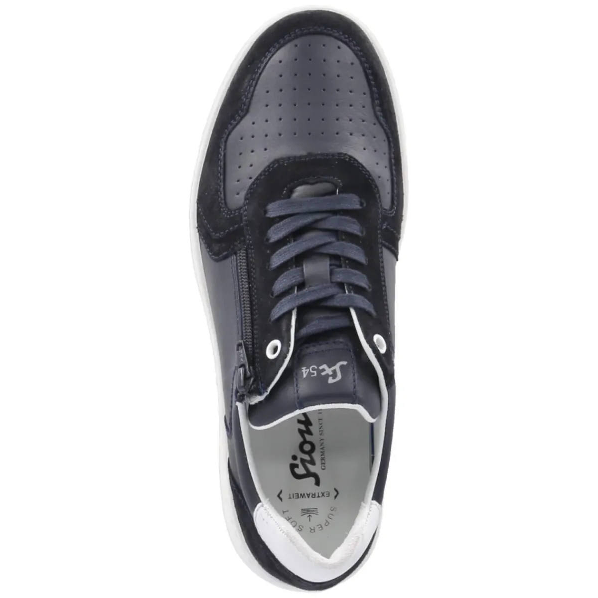 Der Low Sneaker TERTULIO von Sioux verbindet entspannten Komfort mit wertiger Verarbeitung. Das Obermaterial aus langlebigem Echtleder in sattem Blau wirkt modern und gleichzeitig zeitlos. Eine runde Schuhspitze und dezentes Branding unterstreichen die klare Linie. Für bequemes An- und Ausziehen sorgt die Kombination aus Schnürung und zusätzlichem Reißverschluss, der leicht gepolsterte Schaftrand schmiegt sich angenehm an. Das gepolsterte Wechselfußbett mit Lederbezug lässt sich bei Bedarf gegen eigene Einlagen tauschen, die Lederdecksohle unterstützt ein angenehmes Fußklima. Alltagstauglichkeit liefert die flexible, griffige Cupsohle mit rutschhemmenden Eigenschaften sowie die verstärkten Zonen an Zehen und Ferse. Der TERTULIO fällt normal aus und passt zu vielen Looks. Modetipp: Besonders stimmig zu sandfarbener Chino, navy Strickpolo und leichter Fieldjacket.