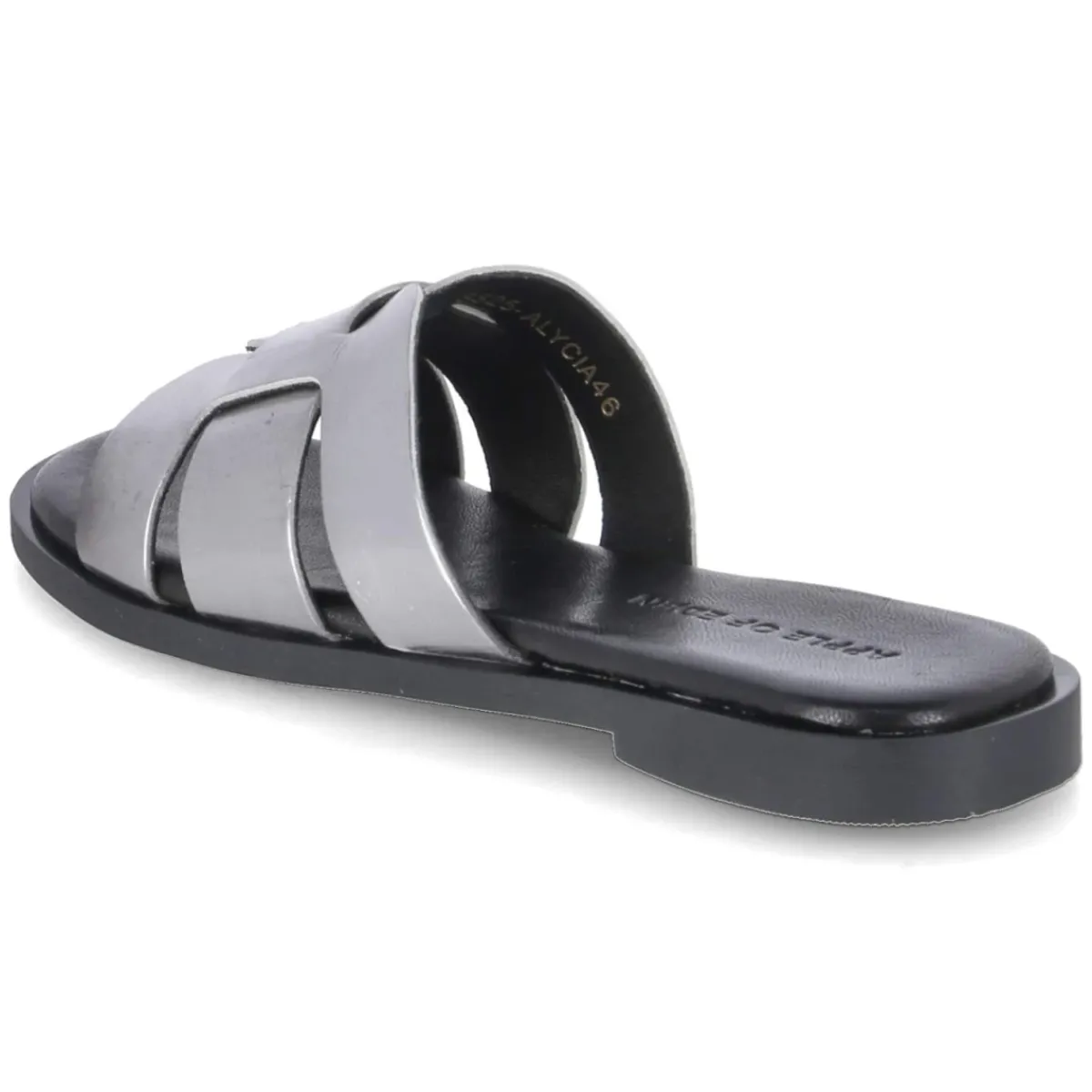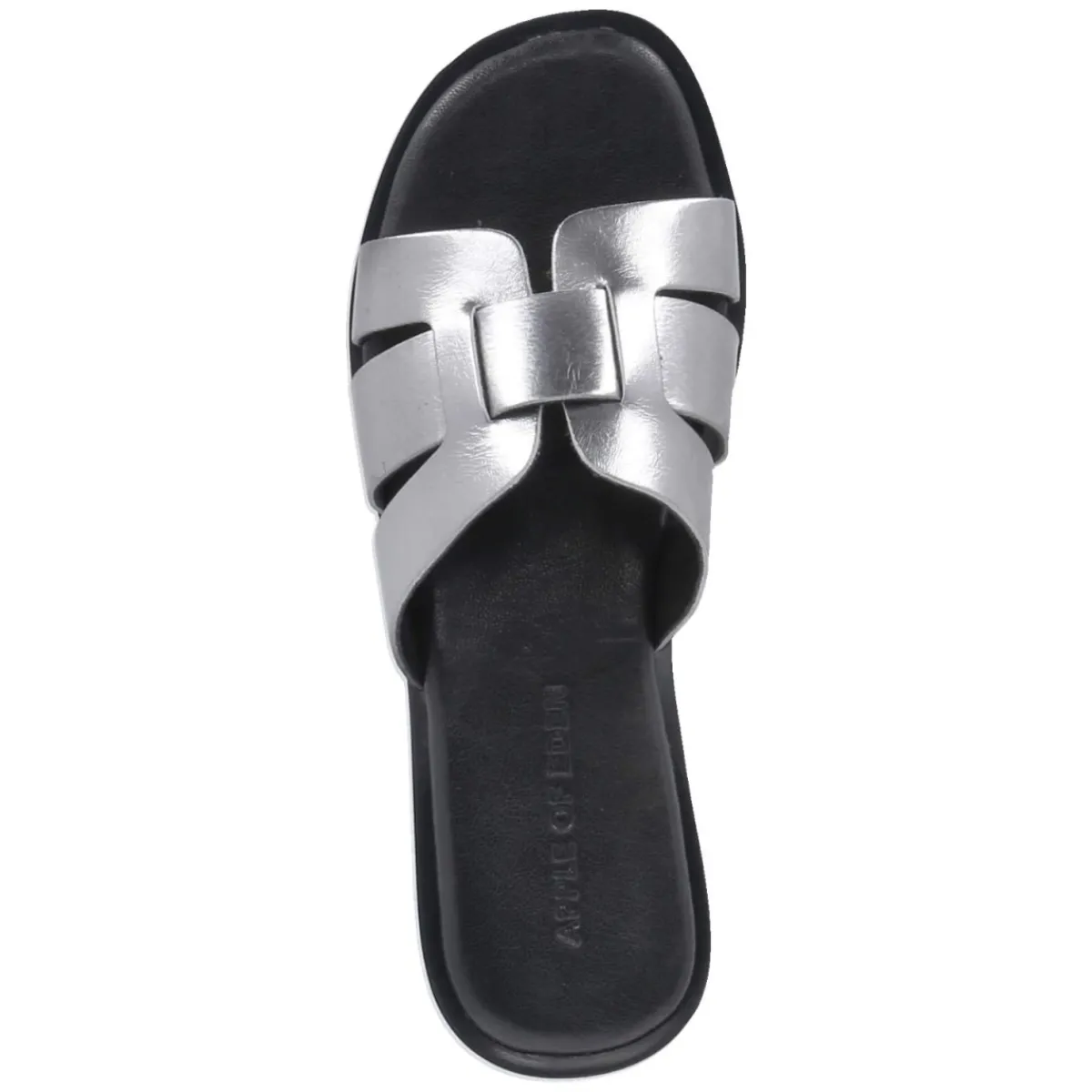 Die Pantoletten ALYCIA von Apple of Eden vereinen moderne Eleganz mit Alltagstauglichkeit. Das silberfarbene Glattleder zeigt eine edel schimmernde Oberfläche, die durch verflochtene Riemen eine feminine Note erhält. Die offene Schuhspitze und das design ohne Verschluss bieten unkomplizierten Komfort, während das gepolsterte Fußbett und die Lederdecksohle weiche Dämpfung über den ganzen Tag sichern. Eine flexible, rutschfeste Laufsohle sorgt für verlässlichen Halt auf unterschiedlichen Untergründen. Das Modell fällt größengetreu aus und lässt sich dank seines metallischen Glanzes vielseitig kombinieren – vom City-Look bis zum abendlichen Auftritt. Modetipp: Zu fließenden Midikleidern in Creme oder Pastell und einer zarten Silberkette entsteht ein harmonisches Ensemble, das den Glanz der Pantoletten subtil aufgreift.
