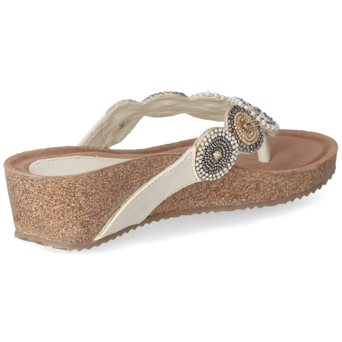 Sommerlicher Auftritt mit den Pantoletten von LAZAMANI: Das weiße Glattleder sorgt für einen frischen Look, während die offene Spitze und der legere Schnitt den Charakter angenehm entspannt halten. Auf der Decksohle aus Leder liegt ein weich gepolstertes Fußbett, das den Fuß sanft abfedert. Sieben kreisförmige Ornamente mit funkelnden Schmucksteinen setzen ein elegantes Highlight und verleihen dem robusten Material-Mix eine feminine Note. Dank flexibler, griffiger Laufsohle und dem praktischen Schlupfeinstieg ohne Verschluss bleibt der Gehkomfort hoch. Das Modell fällt normal aus und lässt sich mühelos in den Alltag integrieren, von Cityspaziergang bis Terrassenabend. Modetipp: Zu naturfarbenen Leinen-Culottes und einem cleanen Tanktop kombinieren, dazu eine Basttasche und filigraner Goldschmuck für einen lässig-edlen Look.