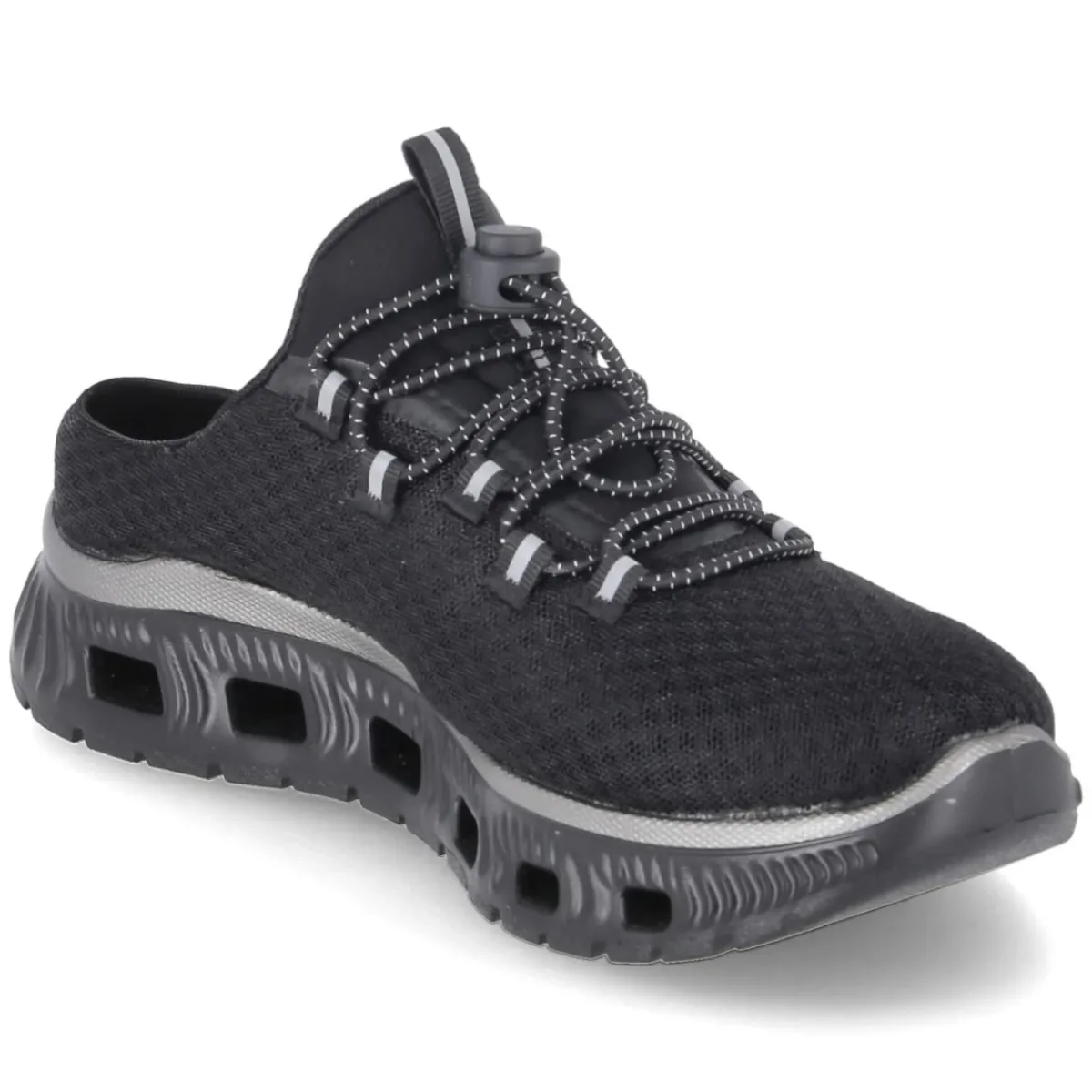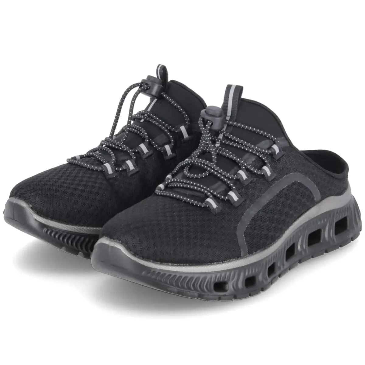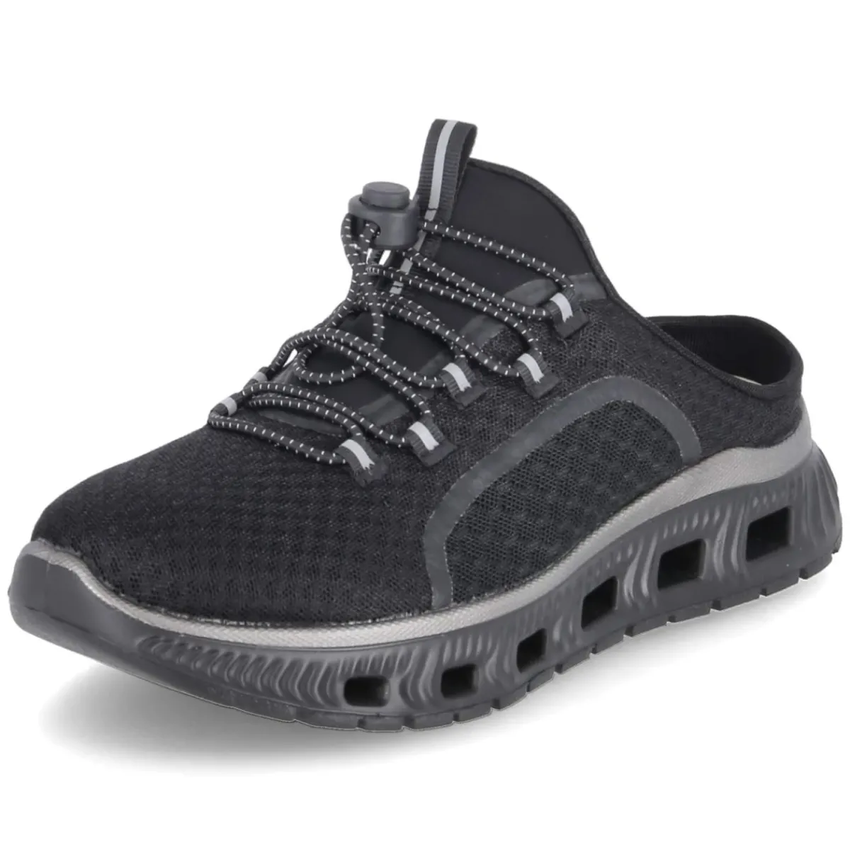 Diese Pantoletten von Rieker in zeitlosem Schwarz verbinden entspannte Leichtigkeit mit komfortorientierter Ausstattung. Das Obermaterial aus Textil liegt angenehm am Fuß, die runde Schuhspitze bietet Zehenfreiheit und die Textil-Decksohle sorgt für ein luftiges Tragegefühl. Für individuellen Halt steht ein praktischer Schnellverschluss bereit. Das Herzstück bildet die beste Memory-Foam-Fußbettung, die jeden Schritt weich abfedert und ein relaxtes Leichtgewicht-Erlebnis vermittelt. Reflektierende Details setzen dezente Akzente und erhöhen die Sichtbarkeit in der Dämmerung. Die flexible, rutschfeste Laufsohle gibt Sicherheit auf unterschiedlichen Untergründen. Als Damenmodell für Erwachsene konzipiert, fällt der Schuh größengetreu aus. Modetipp: Besonders modern wirkt die Pantolette zu weiter Leinenhose und tonalem Top oder als cleaner Kontrast zu fließendem Midikleid in Schwarz-Weiß-Optik.