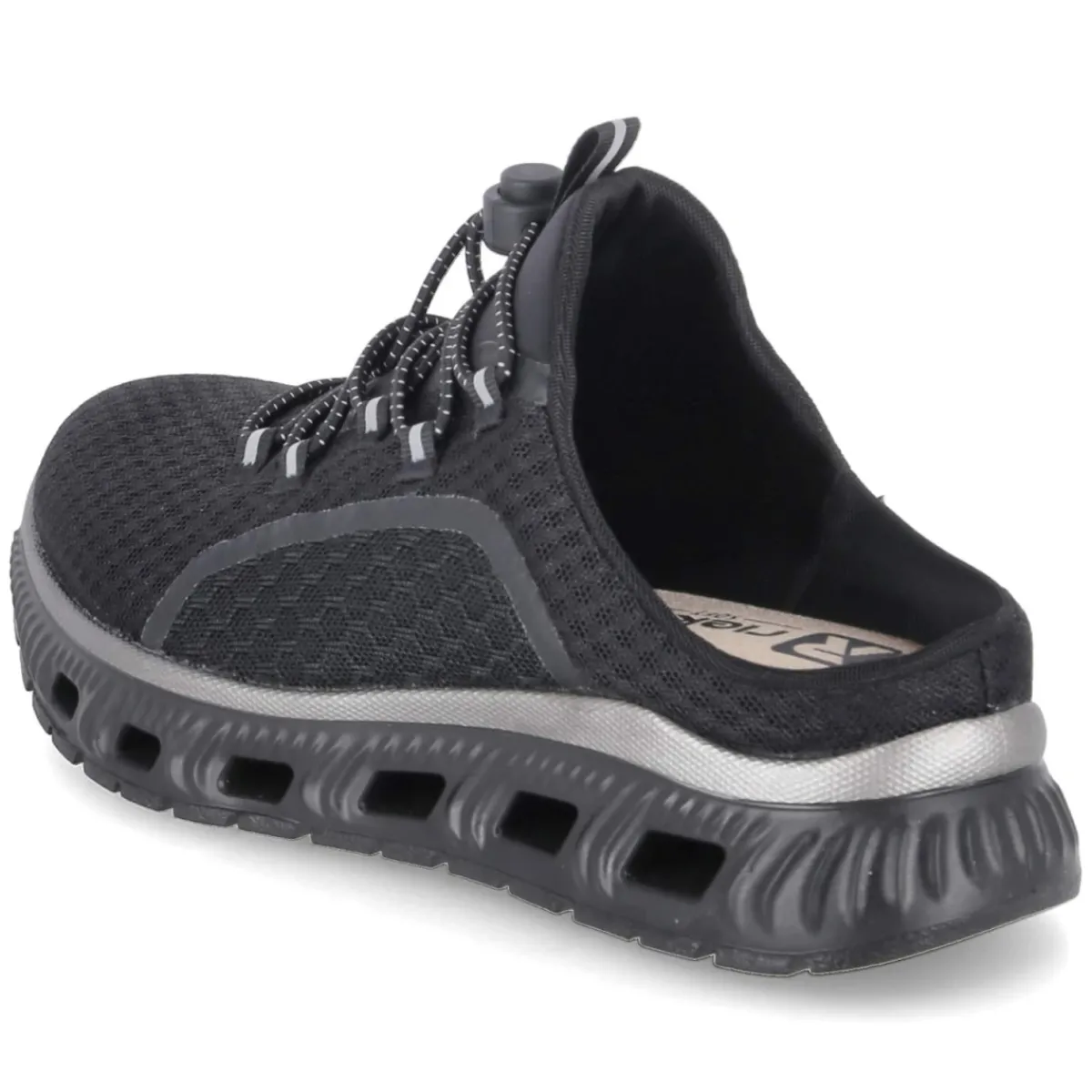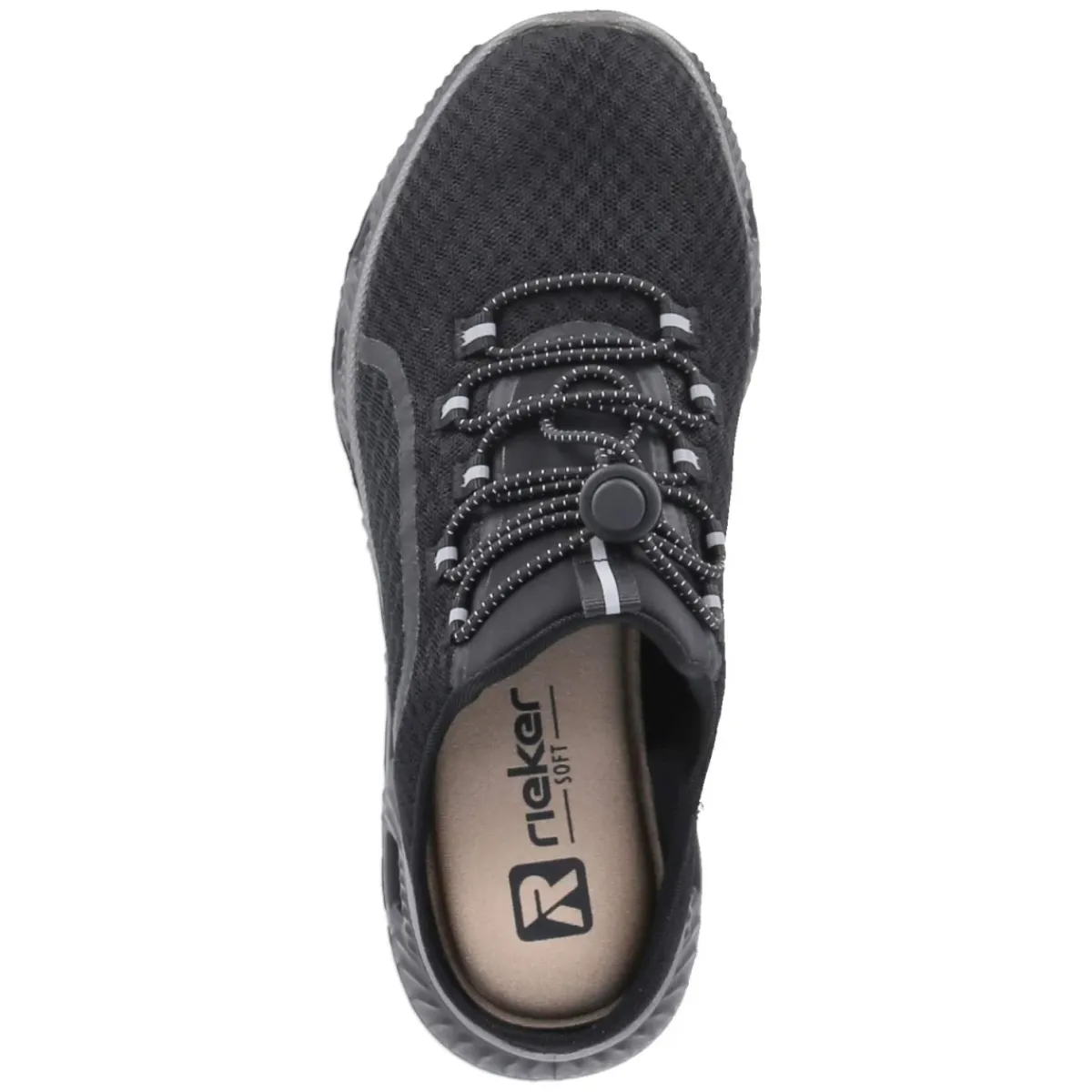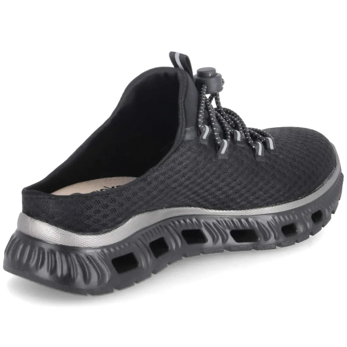 Diese Pantoletten von Rieker in zeitlosem Schwarz verbinden entspannte Leichtigkeit mit komfortorientierter Ausstattung. Das Obermaterial aus Textil liegt angenehm am Fuß, die runde Schuhspitze bietet Zehenfreiheit und die Textil-Decksohle sorgt für ein luftiges Tragegefühl. Für individuellen Halt steht ein praktischer Schnellverschluss bereit. Das Herzstück bildet die beste Memory-Foam-Fußbettung, die jeden Schritt weich abfedert und ein relaxtes Leichtgewicht-Erlebnis vermittelt. Reflektierende Details setzen dezente Akzente und erhöhen die Sichtbarkeit in der Dämmerung. Die flexible, rutschfeste Laufsohle gibt Sicherheit auf unterschiedlichen Untergründen. Als Damenmodell für Erwachsene konzipiert, fällt der Schuh größengetreu aus. Modetipp: Besonders modern wirkt die Pantolette zu weiter Leinenhose und tonalem Top oder als cleaner Kontrast zu fließendem Midikleid in Schwarz-Weiß-Optik.