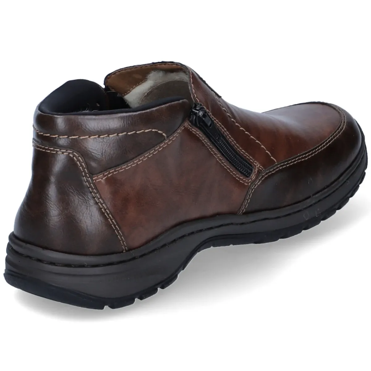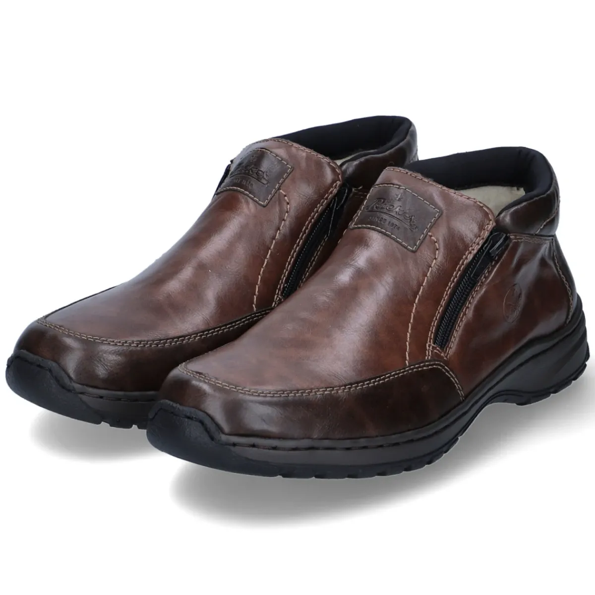 Der Herren-Slipper von Rieker in warmem Braun verbindet unkomplizierten Komfort mit wintertauglicher Behaglichkeit. Das pflegeleichte Kunstleder zeigt eine dezente Struktur, die zusammen mit der runden Schuhspitze für einen zeitlosen Look sorgt. Innen hält ein weiches Warmfutter die Füße angenehm temperiert, während die textile Decksohle ein sanftes Fußklima unterstützt. Seitliche Reißverschlüsse ermöglichen einen schnellen Einstieg und perfekten Sitz, und das Wechselfußbett lässt sich bei Bedarf gegen eigene Einlagen tauschen. Der Schnitt fällt normal aus und macht den Slipper zum zuverlässigen Begleiter für den Alltag. GÖTZ-Artikelnummer 162300210544. Modetipp: Zu dunkler Denim und grob gestricktem Pullover kombinieren, dazu ein Wollmantel in Cognac- oder Karamelltönen für ein stimmiges, urbanes Winter-Ensemble.
