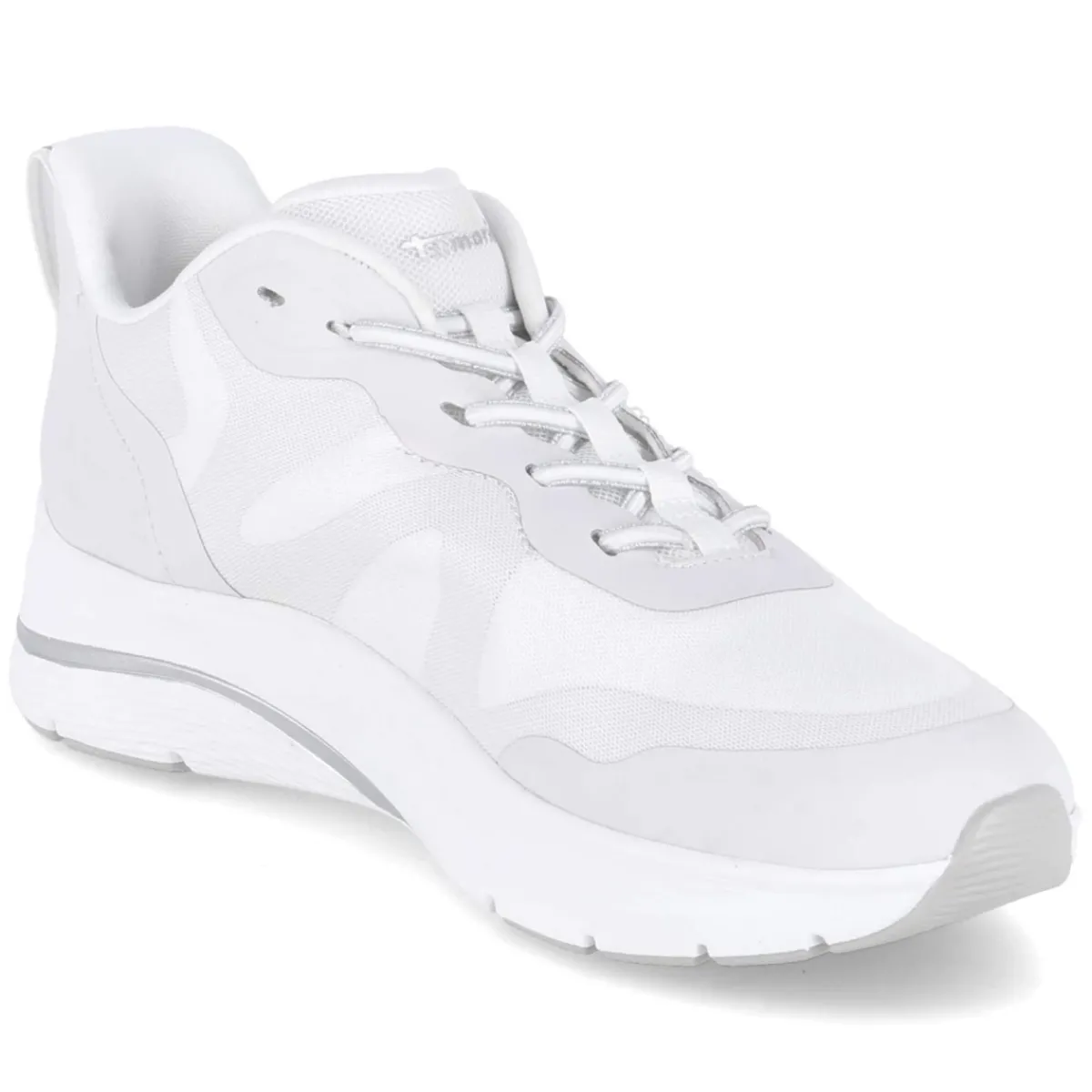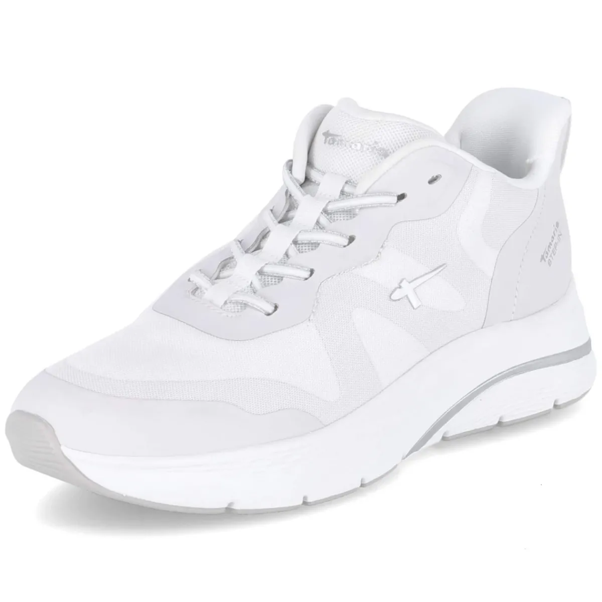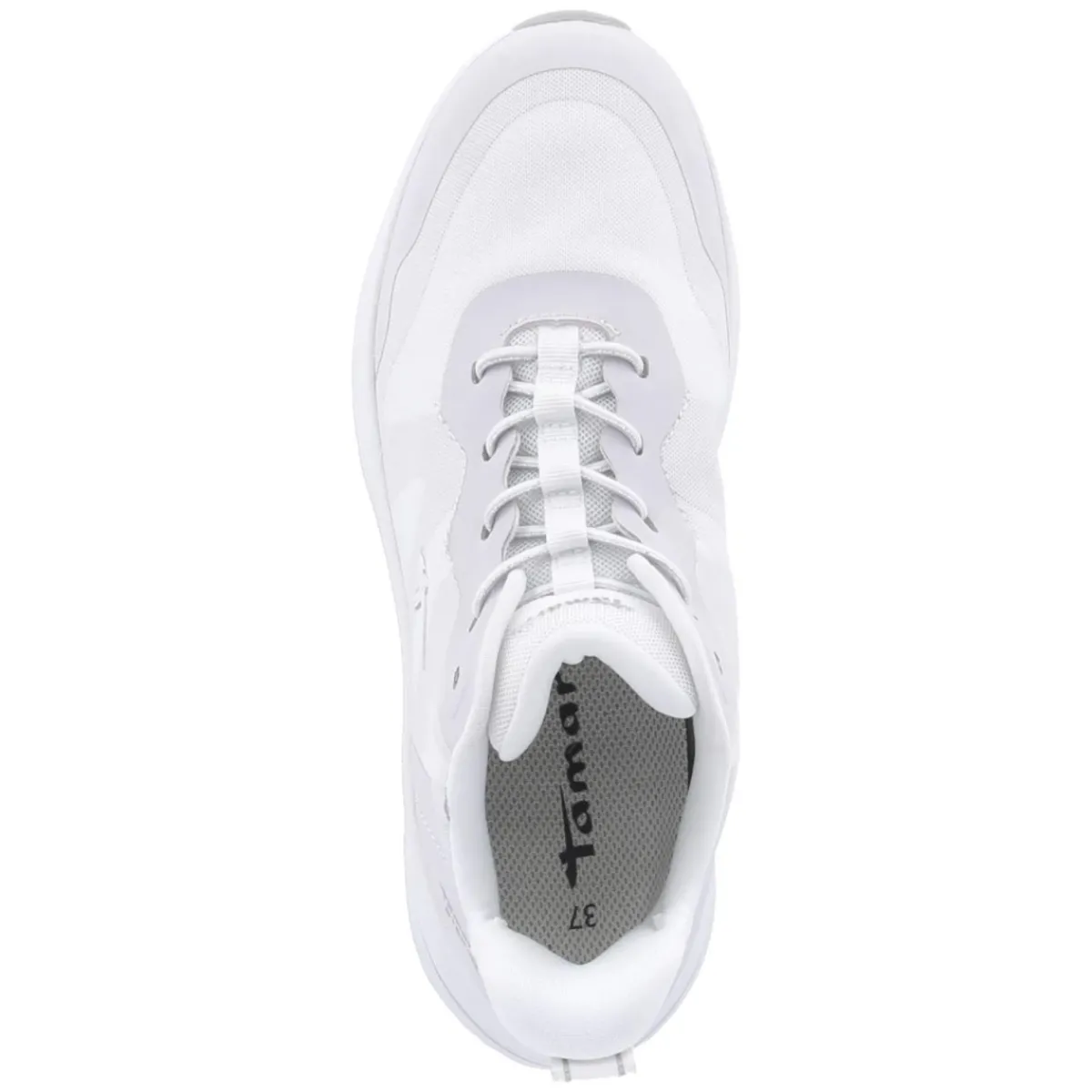 Der weiße Damen-Sneaker von Tamaris setzt auf eine klare, moderne Linienführung und trägt sich dank kluger Materialmischung besonders angenehm. Obermaterial aus Textil und Synthetik schmiegt sich leicht an, während ein Elastikband in Schnüroptik für den lässigen Look sorgt und das Hineinschlüpfen ohne Verschluss erleichtert. Eine textile Decksohle und das komfortable, herausnehmbare Wechselfußbett bieten weiche Dämpfung im Alltag. Verstärkter Zehen- und Fersenbereich erhöht die Formstabilität, die runde Spitze schafft Bewegungsfreiheit. Silberne Akzente setzen dezente Highlights, die flexible, rutschfeste Laufsohle gibt sicheren Halt. Passform fällt normal aus. Gefertigt aus veganen Materialien. Modetipp: Besonders stimmig wirkt das Modell zu hellen Denim-Looks und einem luftigen Stricktop.