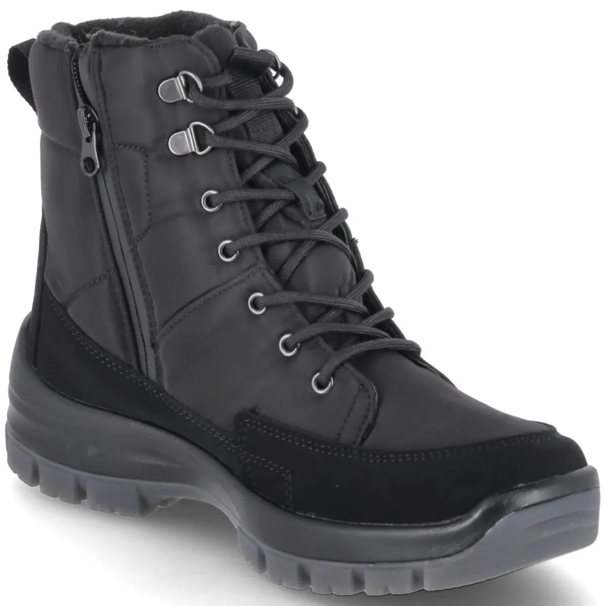 Der Snowboot ALASKA 50 von Josef Seibel vereint zuverlässigen Wetterschutz mit hohem Tragekomfort. Das robuste textile Obermaterial ist wasserfest verarbeitet und zusätzlich wasserabweisend, während die atmungsaktive Konstruktion ein angenehmes Fußklima bewahrt. Warmes Teddyfutter umschließt den Fuß bis über den Knöchel und sorgt an kalten Tagen für wohlige Wärme. Die rutschhemmende Profilsohle bietet sicheren Halt auf glatten Wegen, der verstärkte Fußrahmen erhöht Stabilität und Schutz. Praktisch im Alltag: die Kombination aus Schnürsenkeln und zusätzlichem Reißverschluss für schnellen Einstieg. Die runde Schuhspitze und die normale Passform unterstützen natürliches Abrollen; das Wechselfußbett erlaubt individuelle Einlagen. Modetipp: In Kombination mit dunklen Cargohosen, Wollsocken und einer technischen Parka-Jacke entsteht ein funktionaler Winter-Look in cleanem Schwarz.