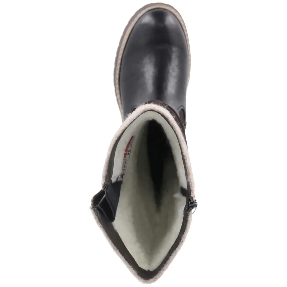 Der Damenstiefel von Rieker vereint wintertaugliche Funktion mit urbanem Stil. In tiefem Schwarz gehalten, schützt das wasserabweisende RiekerTEX mit wasserfestem Material-Mix zuverlässig vor Nässe, während das warme Futter behagliche Wärme spendet. Eine textile Decksohle sorgt für angenehmes Fußklima, die runde Schuhspitze und der 4 cm hohe Blockabsatz bieten entspannten Laufkomfort im Alltag. Der bequeme Reißverschlusseinstieg erleichtert das Anziehen; außen setzt ein Zierreißverschluss modische Akzente. Der dunkelbraune, leicht geraffte Schaft trifft auf eine beige Schaftkrempe aus Filz mit kleinem Elastikeinsatz, der Bewegungsfreiheit schafft. Stabilität liefern die verstärkte Ferse und die rutschfeste Laufsohle, das Obermaterial aus Textil und Synthetik zeigt sich pflegeleicht. Modetipp: zu Strickkleid, Wollmantel und dicken Rippstrümpfen kombinieren – für einen eleganten, wetterfesten City-Look.