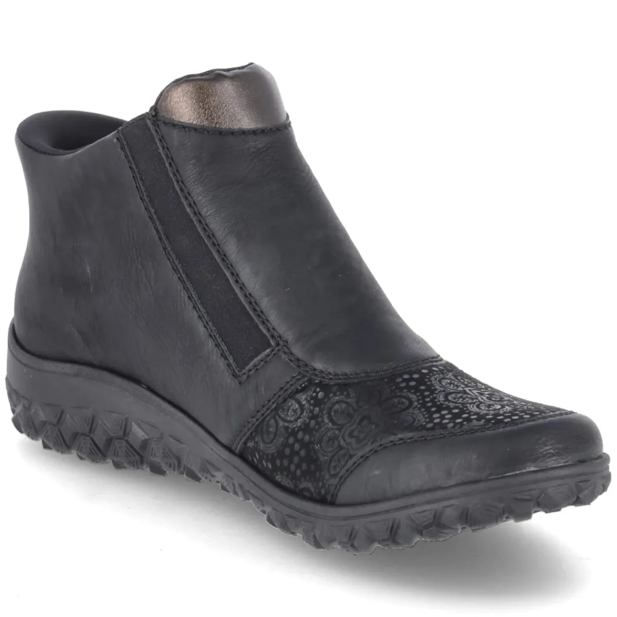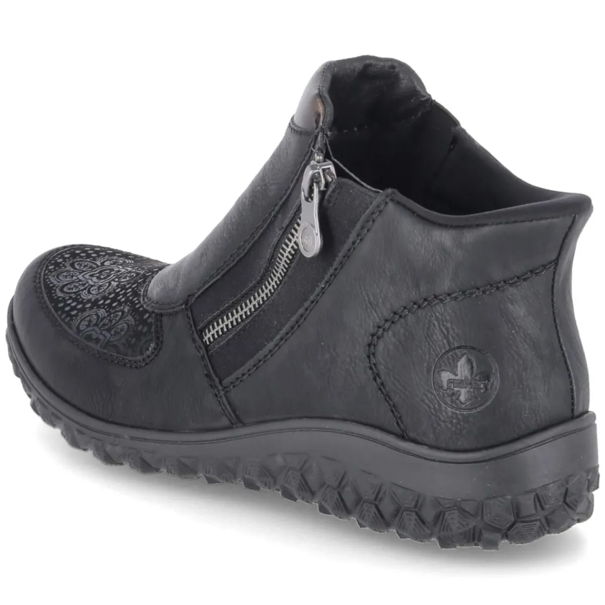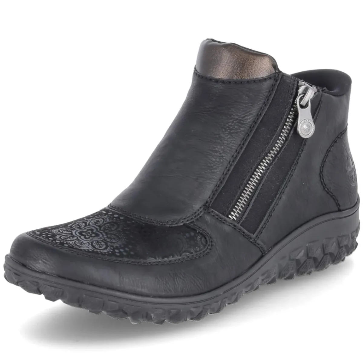 Diese Damen-Stiefeletten von Rieker setzen auf Komfort und zurückhaltende Eleganz. Schwarzes Obermaterial aus Textil und Synthetik mit pflegeleichter Oberfläche wird von dezent gemusterten Textilpartien stilvoll akzentuiert. Der Reißverschluss und ein seitlicher Elastikeinsatz sorgen für einen unkomplizierten Einstieg, während die leicht stretchige Zone im Halluxbereich zusätzlichen Spielraum bietet. Rund gearbeitete Schuhspitzen, ein verstärkter Zehenbereich und die dünne, flexible sowie rutschfeste Laufsohle unterstützen einen entspannten Auftritt im Alltag. Innen verwöhnt ein leichtes Futter an kühlen Tagen, die Decksohle aus Textil fühlt sich angenehm an. Das Wechselfußbett ermöglicht individuelle Einlagen, der Fit fällt normal aus. Modetipp: Besonders schön zu knöchellangen Straight-Jeans und einem Oversize-Wollmantel, alternativ zu Midikleid und blickdichter Strumpfhose.