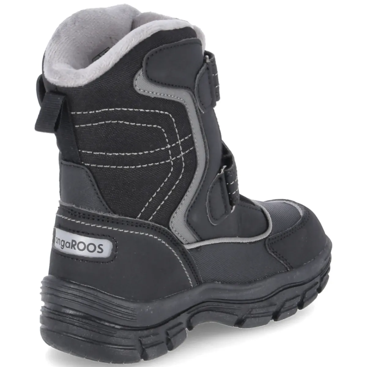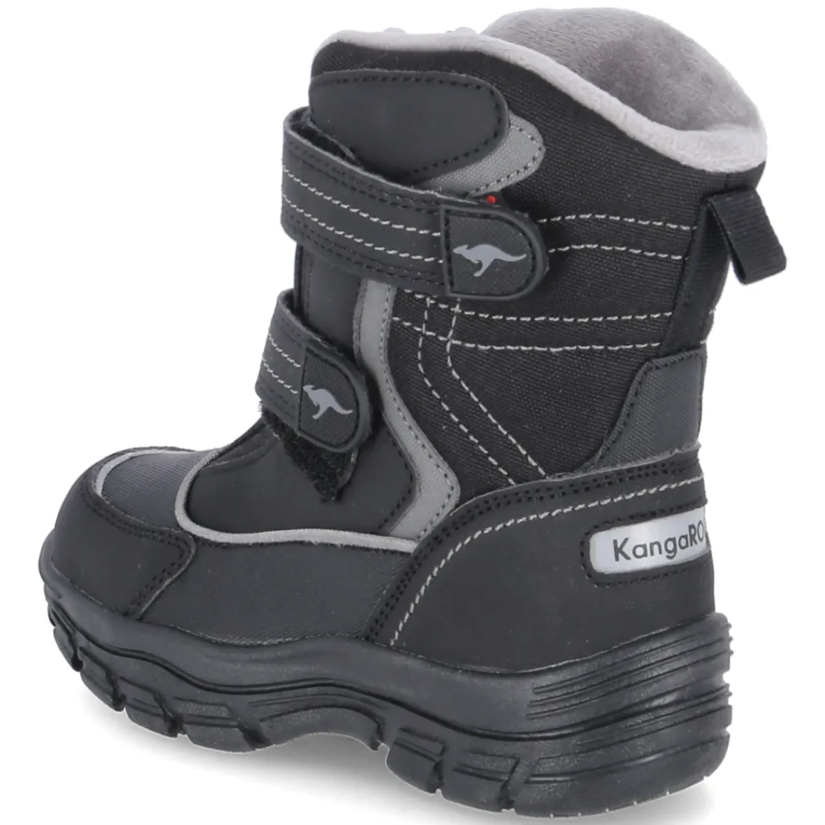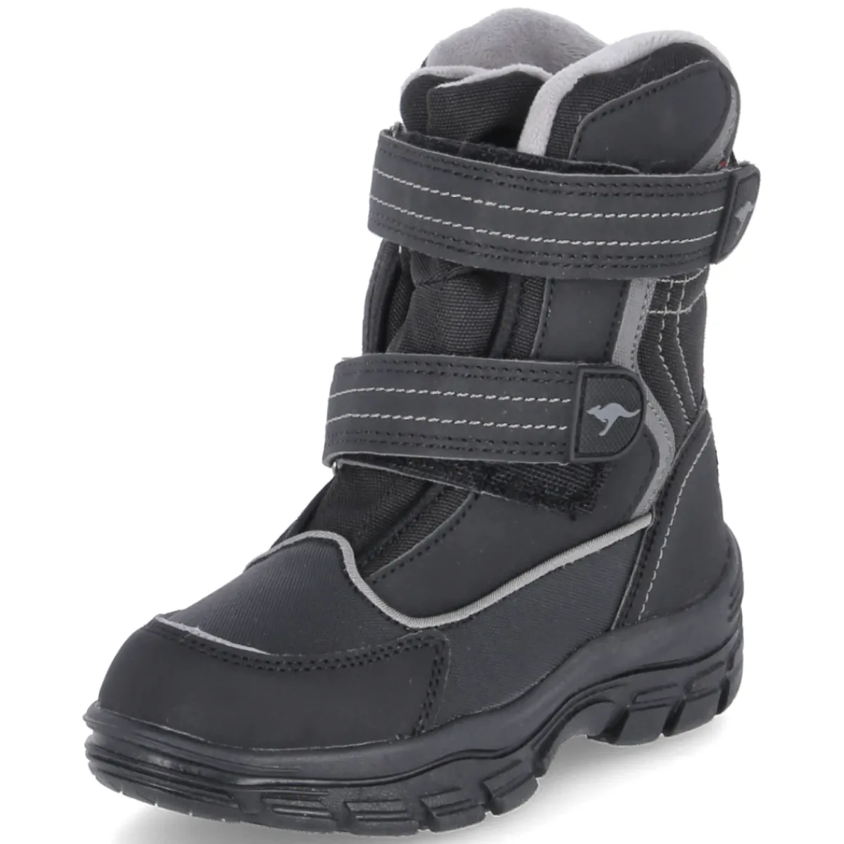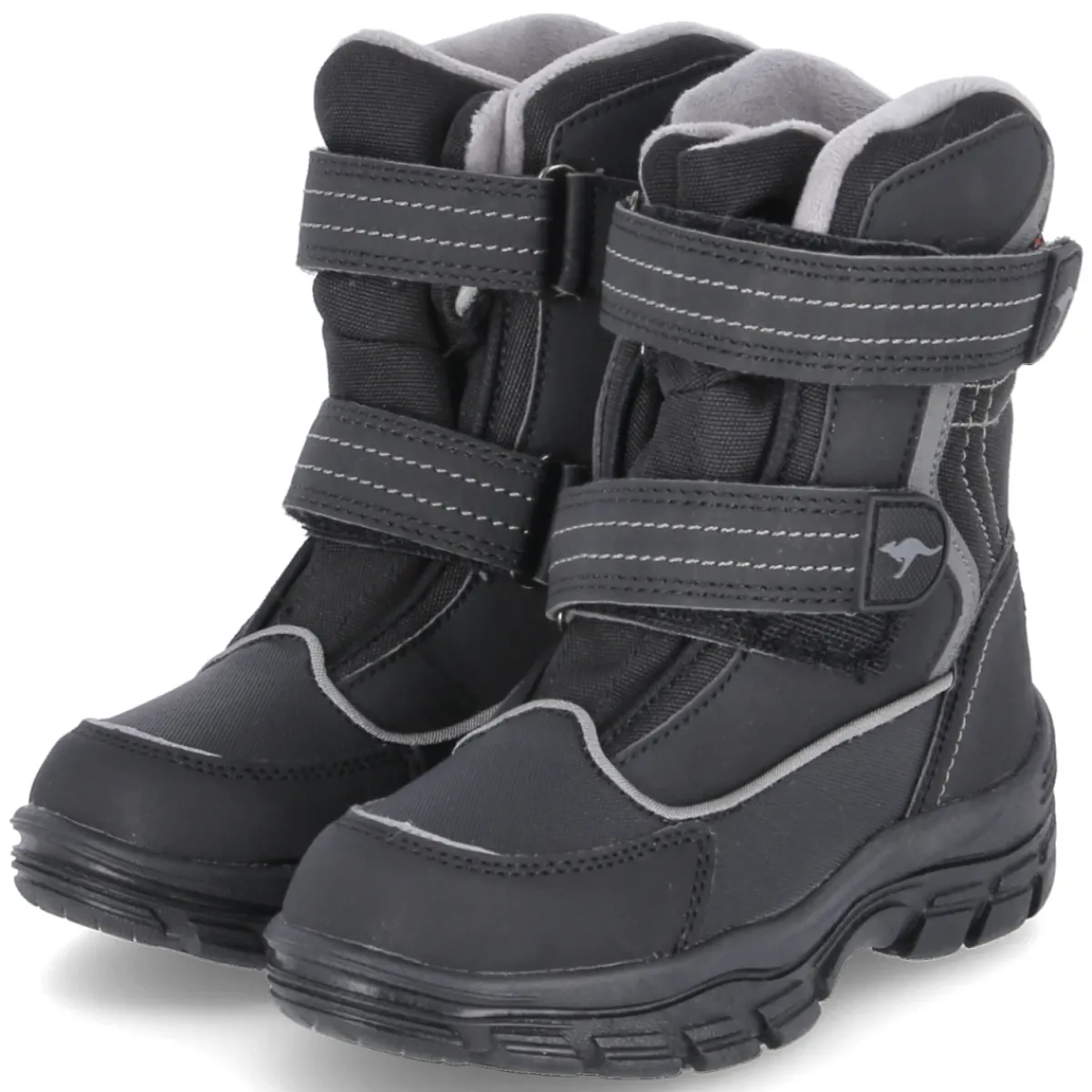 Die Winterboots K-LENO V RTX von Kangaroos verbinden kindgerechten Komfort mit verlässlichem Wetterschutz. Das sportliche Design in Schwarz wird durch ein robustes Obermaterial aus Textil und Synthetik ergänzt, während ROOSTEX Nässe zuverlässig abhält und das Modell wasserfest macht. Warmfutter und gepolsterte Decksohle speichern Wärme und sorgen gemeinsam mit dem gut gepolsterten Einstieg für behagliches Tragegefühl an kalten Tagen. Zwei praktische Klettverschlüsse erleichtern das An- und Ausziehen, die runde Schuhspitze gibt Zehen Bewegungsfreiheit. Verstärkungen an Zehen und Ferse erhöhen die Haltbarkeit, die flexible, rutschhemmende Laufsohle bietet sicheren Grip auf winterlichen Wegen. Das Modell fällt größengetreu aus und eignet sich ideal für aktive Kleinkinder. Modetipp: Zu softem Fleece, einer Steppjacke in Signalton und einer farbigen Strickmütze entsteht ein funktionaler, moderner Winterlook.