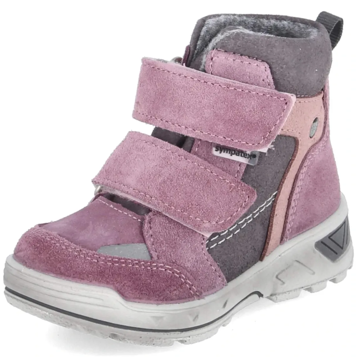 Der Winterstiefel JANNE von Pepino vereint Schutz, Komfort und kindgerechtes Design. Das warme Futter umschließt die Füße an kalten Tagen, während der wasserfeste Material-Mix mit Sympatex-Ausstattung Nässe zuverlässig abhält. Die runde Spitze und der gepolsterte Einstieg sorgen für ein angenehmes Tragegefühl, die praktischen Klettverschlüsse erleichtern das An- und Ausziehen. Reflektierende Details erhöhen die Sichtbarkeit in der Dämmerung, eine Anziehlasche hilft beim schnellen Hineinschlüpfen. Der verstärkte Fersen- und Zehenbereich bietet zusätzliche Stabilität, die flexible, rutschfeste Profilsohle gibt Halt auf winterlichen Wegen. Die Passform fällt normal aus; das Wechselfußbett aus Textil lässt sich zum Lüften unkompliziert entnehmen. Modetipp: Perfekt zu Softshellhose, Strickmütze und einem grauen Parka; der Violettton setzt frische Farbakzente im Winterlook.