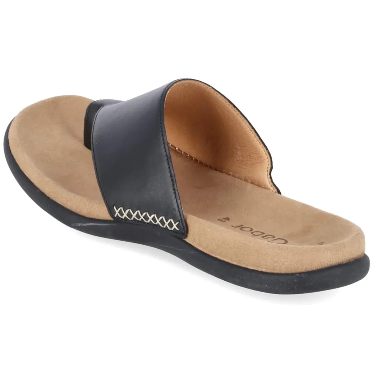Der Zehentrenner von Gabor verbindet lässige Sommerleichtigkeit mit eleganter Zurückhaltung. Schwarzes Glattleder in langlebiger Qualität formt eine schmale Silhouette, die dank offenem Schnitt luftig bleibt und durch den seitlichen Kreuzstich eine feine, handwerkliche Note erhält. Die flexible, griffige Laufsohle sorgt auf Stadtpflaster wie auf Strandpromenaden für verlässlichen Halt, während das dämpfende, vorgeformte Fußbett zusammen mit der weichen Textildecksohle spürbaren Komfort über den ganzen Tag liefert. Ohne Verschluss gleitet der Fuß mühelos hinein, und die Passform fällt normal aus. Das elegante Design lässt sich vielseitig kombinieren, von fließenden Stoffen bis hin zu klarer Tailoring-Optik. Modetipp: Für einen modernen Mono-Look schwarze Leinenhose und tonige Accessoires wählen; ein zarter Goldreif setzt einen warmen Akzent zum kühlen Lederfinish.