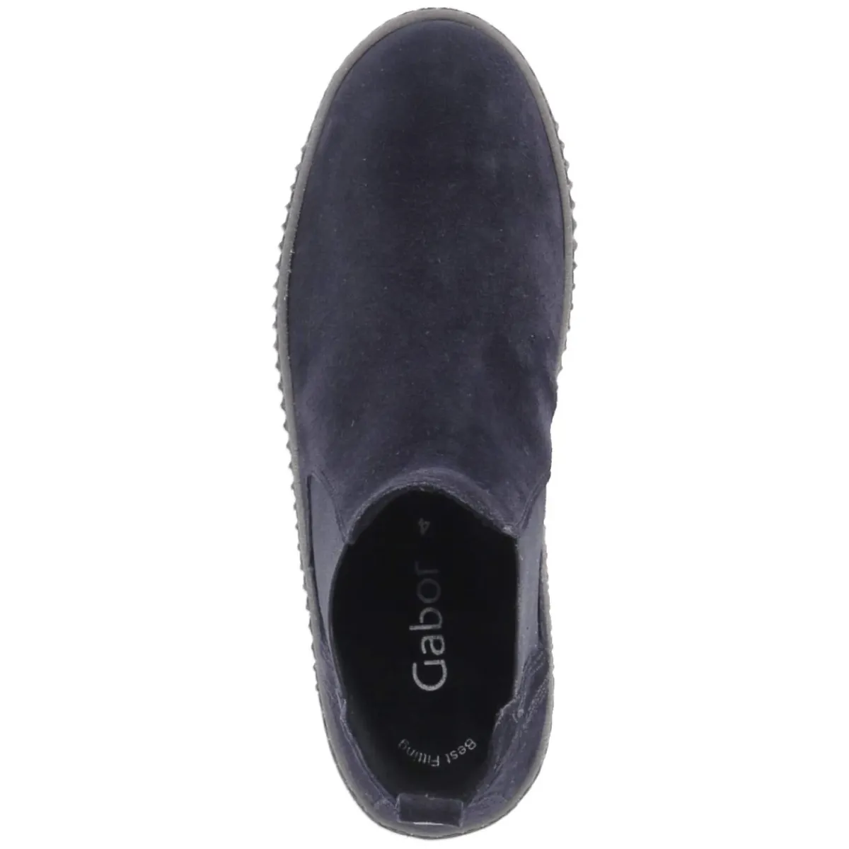 Eleganter City-Begleiter in sattem Dunkelblau: Der Gabor Chelsea Boot aus langlebigem Echtleder mit softem Rauleder-Finish verbindet zeitlose Form mit modernem Komfort. Die runde Spitze und der schlanke Leisten verleihen eine feminine Silhouette, zwei elastische Einsätze sorgen für den unkomplizierten Einstieg. Innen unterstützt eine weiche Textil-Decksohle das angenehme Tragegefühl, das komfortable Wechselfußbett lässt sich bei Bedarf austauschen. Die flexible, rutschfeste Laufsohle mit seitlichen Rillen bietet verlässlichen Grip, während die verstärkte Ferse Stabilität gibt – ideal für längere Tage in Büro und Freizeit. Das Modell fällt schmaler aus; häufig wird eine Nummer größer gewählt. Modetipp: Ton-in-Ton zu dunkelblauer Cropped-Jeans und Wollmantel kombinieren, dazu silberne Accessoires setzen einen frischen Akzent zum maritimen Farbspiel.