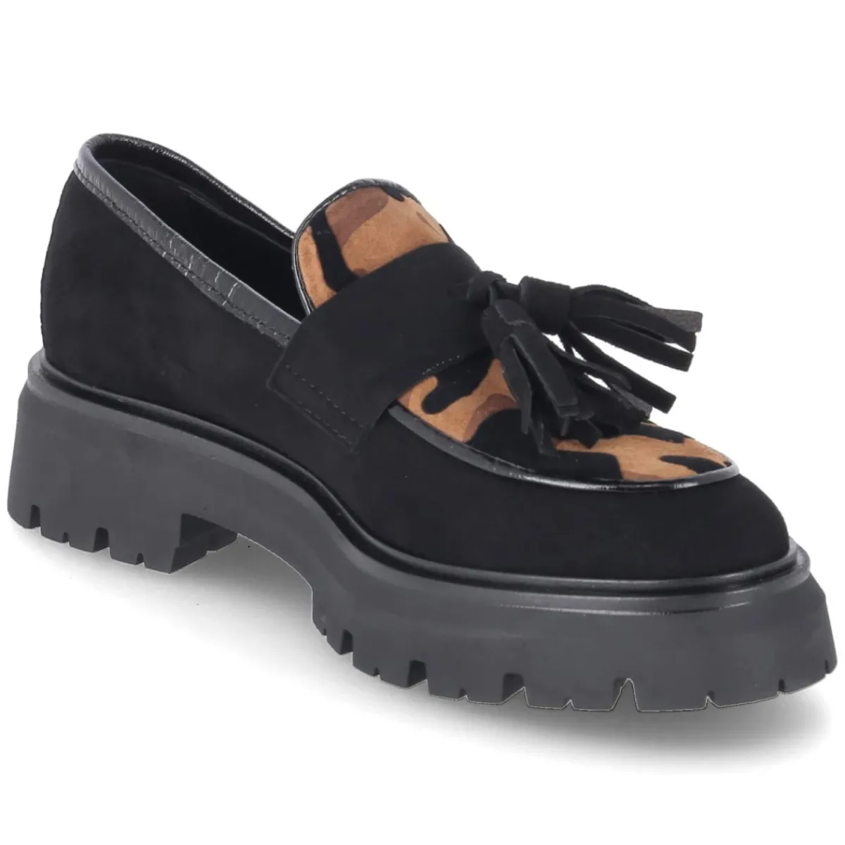 Kaerlek interpretiert den klassischen Damen-Loafer mit markantem Auftritt: Schwarzes Rauleder aus robustem Echtleder trifft auf einen 4,5 cm hohen Blockabsatz und eine starke Profilsohle, die sicheren Tritt und urbanen Charakter verleiht. Das rund zulaufende Blatt mit braunem Camouflageprint setzt einen raffinierten Kontrast, während der Zierriemen mit Quasten den Look elegant abrundet. Dank bequemem Fersenpolster, verstärkter Ferse und angenehm gepolsterter Decksohle aus Synthetik bleibt der Slip-on-Komfort ohne Verschluss den ganzen Tag erhalten. Die Passform fällt normal aus und bietet vielseitige Kombinationsmöglichkeiten vom Office bis zum Weekend. Modetipp: Mit verkürzter Anzughose und feiner Stricksocke entsteht ein kontemporärer Preppy-Style, der das Camouflage-Detail subtil in Szene setzt.