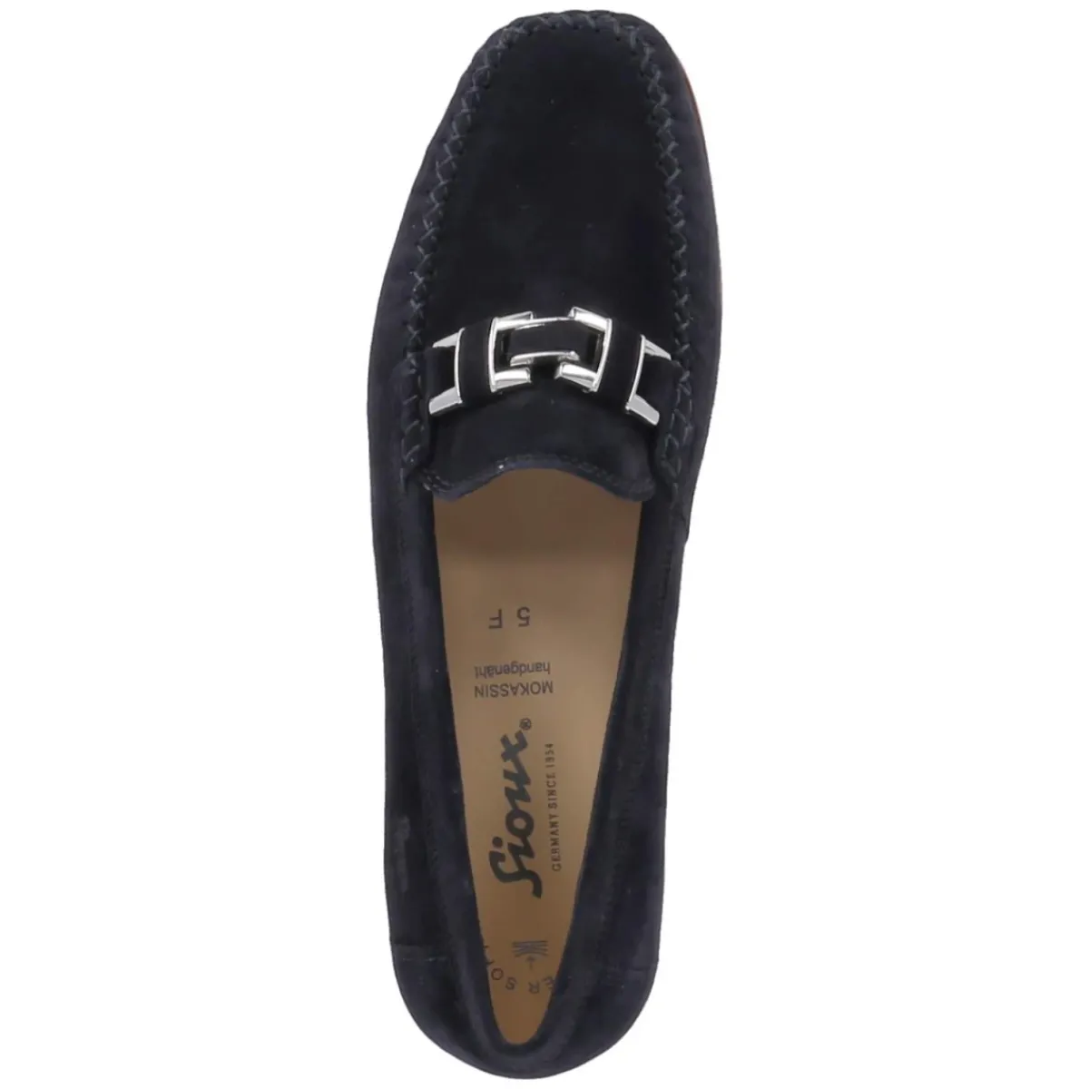 Der Mokassin CAMBRIA von Sioux verbindet eine samtige Oberfläche aus feinem Rauleder mit zeitloser Eleganz. Das tiefe Blau kann je nach Licht fast schwarz wirken und wird vom silbern glänzenden Zierriemen dezent veredelt. Die runde Schuhspitze und der schmale Blockabsatz in Holzoptik sorgen für eine feminine Linie, während verstärkte Ferse, Lederfutter und die hautfreundliche Lederdecksohle gepflegten Komfort bieten. Die sehr flexible, dünne Laufsohle unterstützt einen geschmeidigen Abrollvorgang, das Schlupf-Design ohne Verschluss erleichtert den Einstieg. Die Passform fällt normal aus und eröffnet gute Kombinationsmöglichkeiten vom Office-Look bis zum Wochenend-Style. Modetipp: Ton-in-Ton mit dunkelblauer Zigarettenhose und heller Bouclé-Jacke tragen oder mit gestreiftem Shirt und cropped Jeans für eine moderne, maritime Note inszenieren.