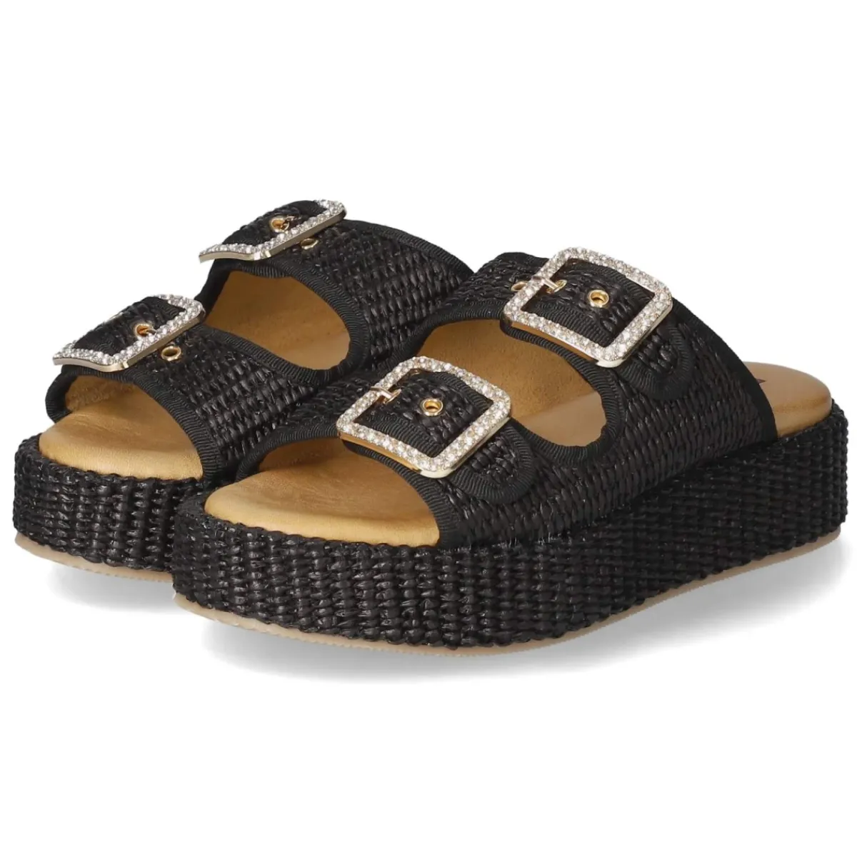 Pantoletten NERO von Kaerlek verbinden moderne Optik mit komfortabler Konstruktion. Das schwarze Modell setzt auf eine 4,5 cm hohe Plateau-Absatzform, die die Silhouette dezent streckt und dank breiter Auflagefläche stabil wirkt. Zwei goldfarbene Schnallen mit funkelnden Schmucksteinen verleihen Glamour; Details in Sisaloptik bringen sommerliche Struktur. Ein modern designtes Obermaterial aus Synthetik trifft auf eine Decksohle aus Leder, während das weich gepolsterte Fußbett angenehmen Halt schenkt. Die offene Schuhspitze unterstreicht die luftige Anmutung, der verstellbare Schnallenverschluss sorgt für passgenauen Sitz. Das Modell für Damen fällt normal aus und überzeugt im Alltag ebenso wie abends. Modetipp: Besonders edel wirkt die Pantolette zu einem monochromen Schwarz-Look mit goldenen Accessoires oder zu Raw-Denim und weißem Oversize-Hemd.