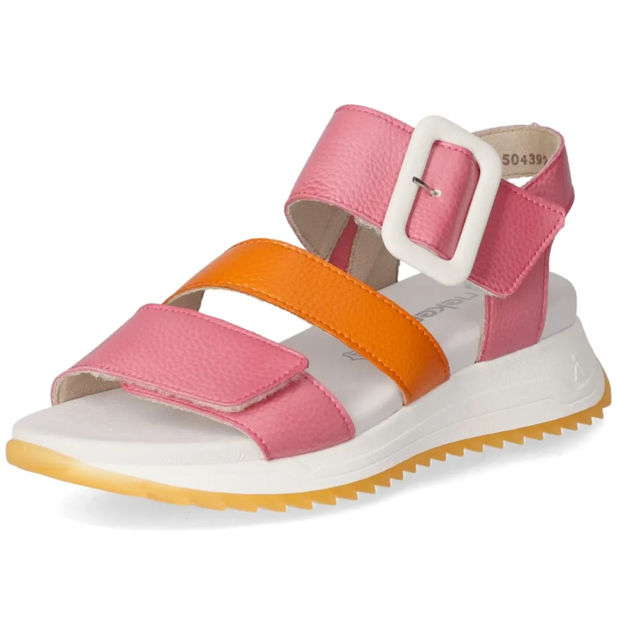 Diese Sandaletten von Rieker verbinden sommerliche Leichtigkeit mit alltagstauglichem Komfort. Das hochwertige Glattleder zeigt sich in sanftem Rosa und erhält durch einen orangen Riemen und eine weiße Zierschnalle einen frischen Farbakzent. Zwei Klettverschlüsse ermöglichen eine schnelle Weitenregulierung, während kleine Elastikeinsätze geschmeidige Bewegungen unterstützen. Die offene Schuhspitze sorgt für luftig-leichte Tragbarkeit, das gepolsterte Lederfußbett und die hautfreundliche Lederdecksohle schmeicheln dem Fuß. Dank rutschfester Sohle und normal ausfallender Passform gelingen lange Stadtspaziergänge ebenso wie spontane Abende im Freien. Modetipp: Für einen modernen Sommerlook mit Leinen-Shorts und einem fließenden Blusentop kombinieren, dazu feiner Goldschmuck und eine Basttasche für einen lässig-eleganten Finish.