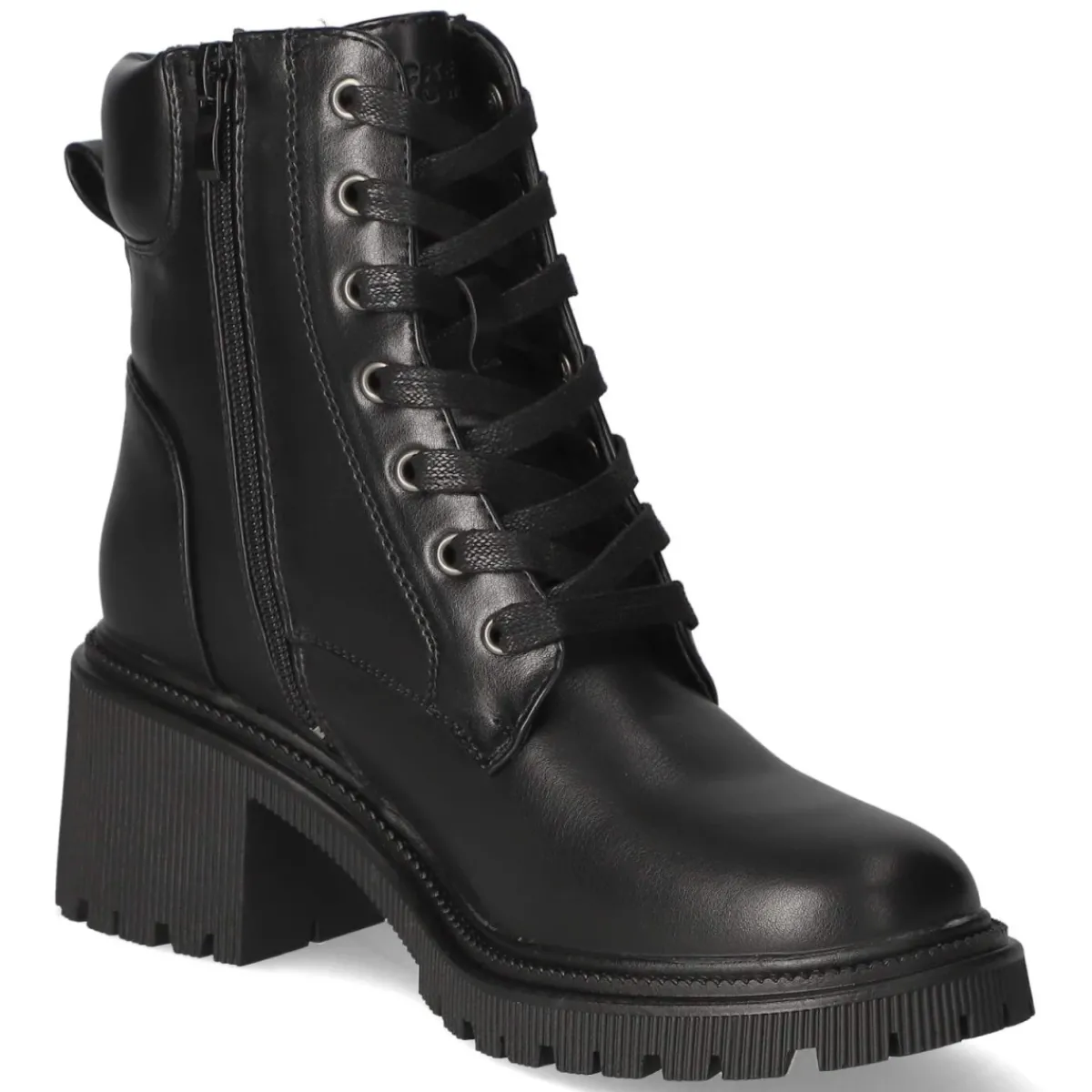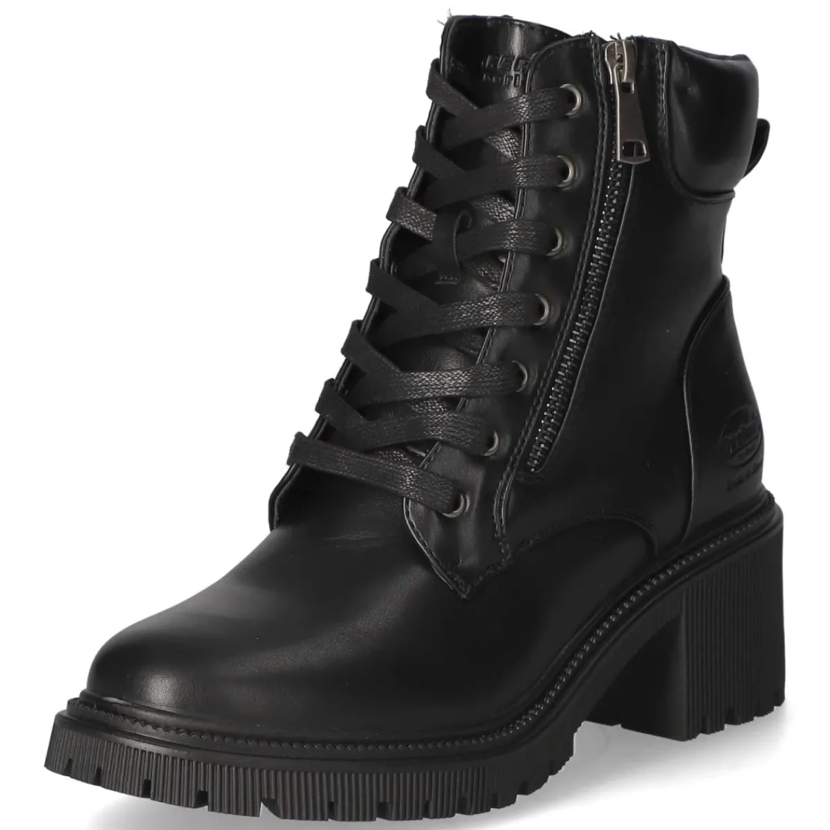 Die Dockers Schnürstiefeletten für Damen verbinden urbane Robustheit mit alltagstauglichem Komfort. Das Obermaterial aus widerstandsfähiger Synthetik zeigt sich in tiefem Schwarz, ergänzt um ein dezentes Markenlogo. Die runde Spitze und der 6 cm hohe Blockabsatz sorgen für einen ausgewogenen Auftritt, der Stabilität bietet und die Silhouette dezent streckt. Für angenehmes Tragegefühl stehen das gepolsterte Fußbett, die textile Decksohle sowie der weich gepolsterte Einstieg. Eine verstärkte Ferse unterstützt zusätzlich den Halt. Schnürsenkel erlauben individuelle Anpassung, während der seitliche Reißverschluss das An- und Ausziehen erleichtert; die Anziehlasche bringt Extra-Komfort. Die Passform fällt größengetreu aus und passt damit zuverlässig in den Alltag von Beruf bis Freizeit. Modetipp: Zu einer schmalen Jeans und einem Oversize-Strick kombiniert entsteht ein moderner Kontrast aus schlanker Silhouette und markantem Boot.