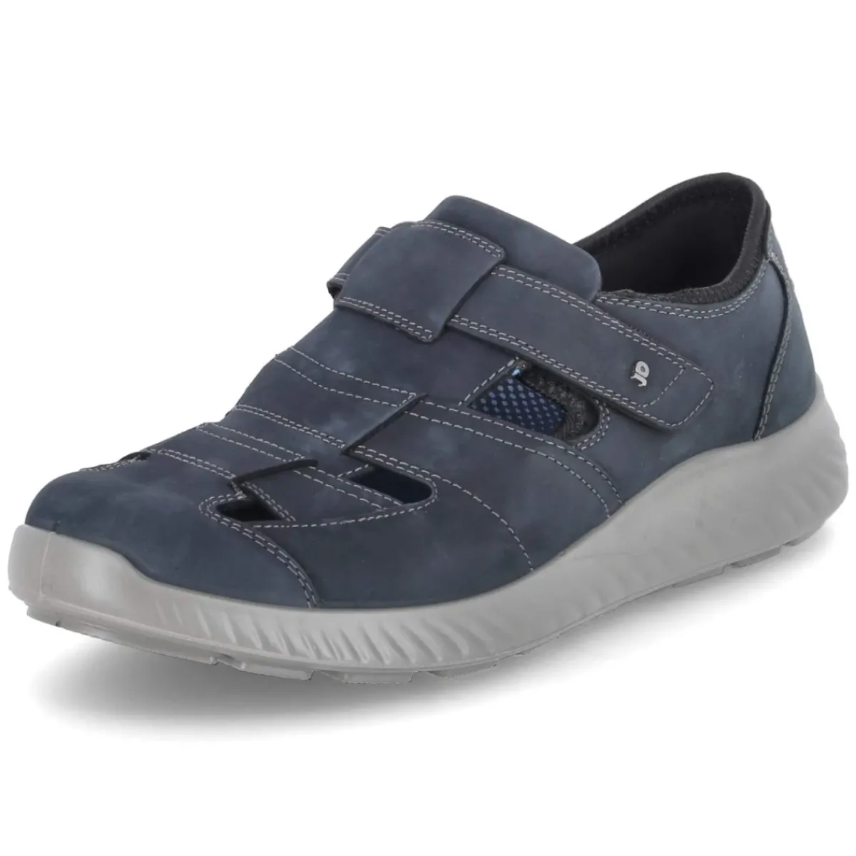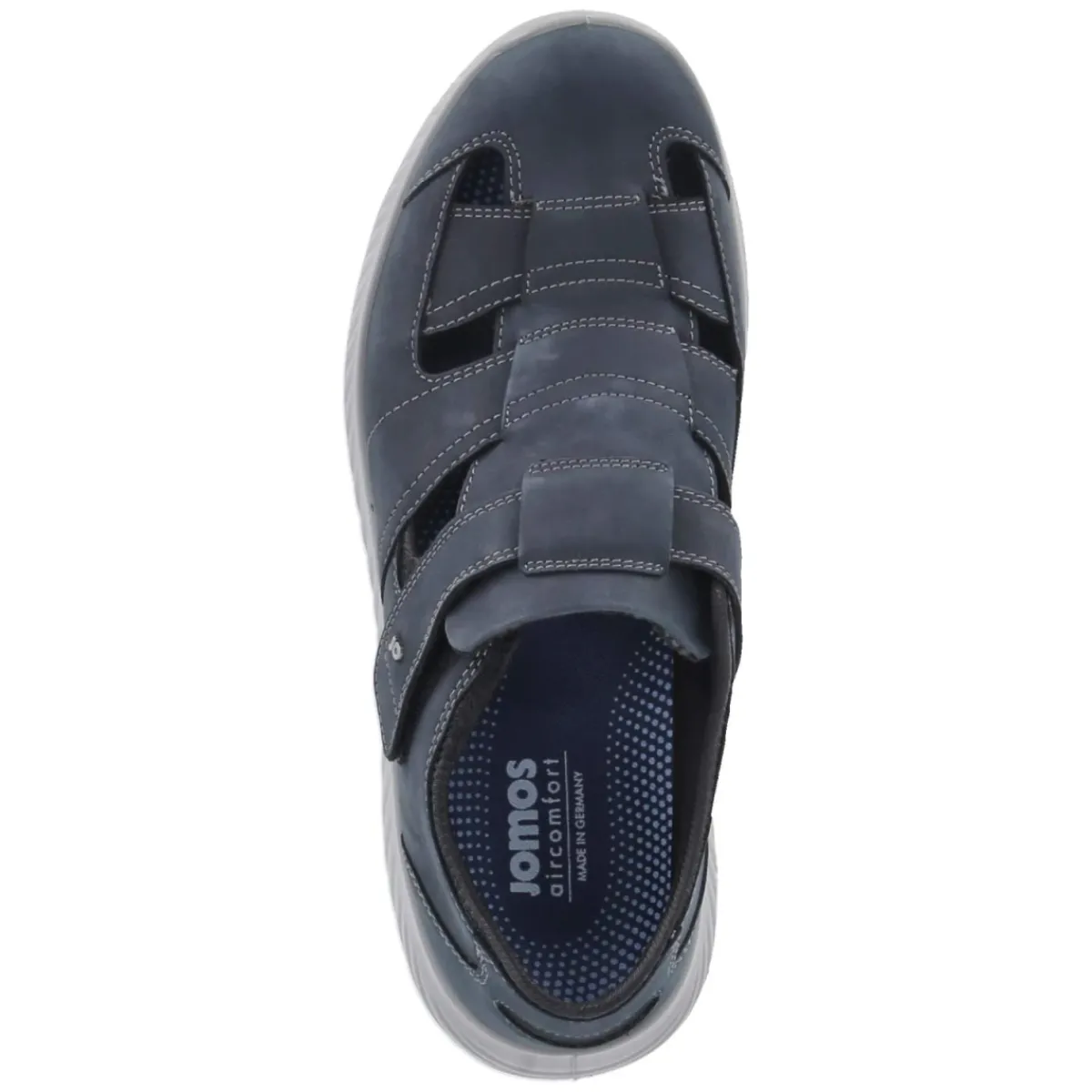 Der Jomos Slipper für Herren verbindet sommerliche Leichtigkeit mit verlässlicher Alltagstauglichkeit. Das Obermaterial aus weichem Rauleder in zeitlosem Blau zeigt sich robust als langlebiges Echtleder, während die runde Schuhspitze angenehme Zehenfreiheit gewährt. Vorn sorgen luftige Schlitze zwischen den Riemen für ein frisches Trageklima, ergänzt durch eine atmungsaktive Decksohle aus Textil. Ein Klettriemen mit bequemer Klettverschluss-Lösung ermöglicht rasches An- und Ausziehen sowie fein dosierbaren Halt. Die verstärkte Ferse stabilisiert bei jedem Schritt, die flexible, rutschfeste Laufsohle gibt Sicherheit auf verschiedensten Untergründen. Das komfortable Wechselfußbett unterstützt den Fuß den ganzen Tag und lässt sich bei Bedarf gegen eigene Einlagen austauschen. Der Slipper fällt normal aus und passt so zuverlässig zur gewohnten Größe. Modetipp: Besonders stimmig zu beige- oder graumelierter Chino und leichtem Poloshirt; der Blauton setzt einen klaren, gepflegten Akzent.