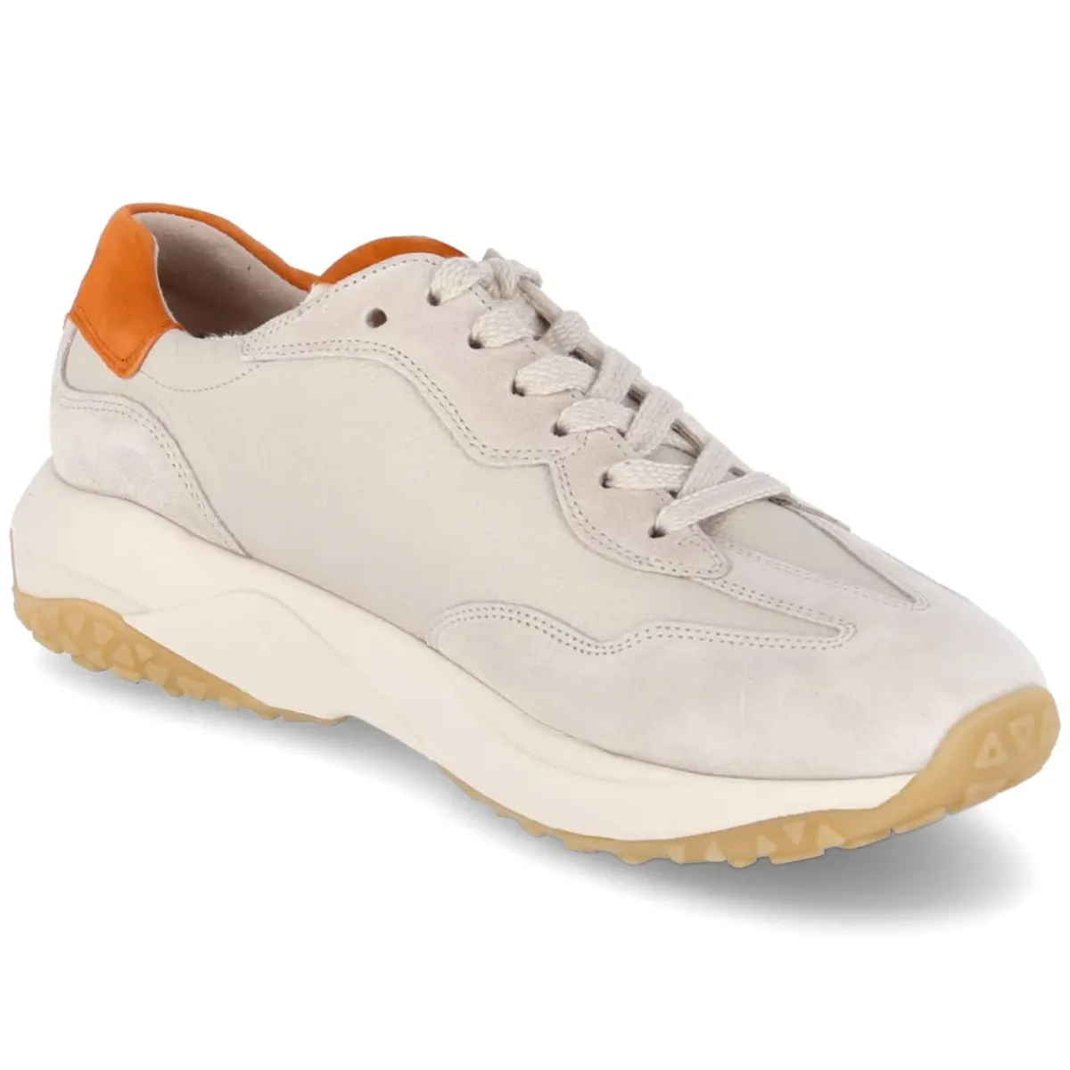 Dieser beige Sneaker von Paul Green verbindet urbanen Chic mit durchdachtem Komfort. Der stilvolle Ledermix setzt eine feine Struktur, während orange Highlights der modernen Optik frische Energie geben. Die runde Spitze und die seitliche Lochung sorgen für ein luftiges Tragegefühl, der gepolsterte Einstieg und das weich gepolsterte Wechselfußbett verwöhnen bei jedem Schritt. Für Stabilität im Alltag stehen der verstärkte Zehen- und Fersenbereich sowie die rutschhemmende Laufsohle. Die Lederdecksohle und die klassische Schnürung sichern einen hochwertigen, passgenauen Sitz, die Passform fällt normal aus. Ein vielseitiger Begleiter für City, Büro und Freizeit, der feminine Leichtigkeit mit sportiver Note verbindet. Modetipp: Mit cremefarbener Wide-Leg-Hose und einem sandigen Stricktop entsteht ein edler Ton-in-Ton-Look; ein Gürtel oder eine Crossbody-Bag mit orangefarbenem Akzent greift die Details stilvoll auf.