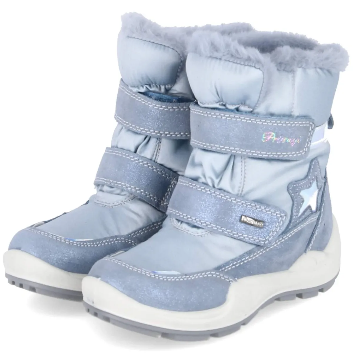 Die blauen Snowboots von Primigi verbinden kindgerechten Komfort mit verlässlichem Wetterschutz. Obermaterial aus Leder und Textil umschließt dank verstärkter Zehen- und Fersenzonen sicher den Fuß, während die runde Spitze Bewegungsfreiheit lässt. Eine Gore-Tex Membran hält zuverlässig wasserfest und atmungsaktiv, ideal für nasse Wintertage. Warmfutter und gepolsterter Einstieg mit Kunstfellkragen sorgen für kuschelige Wärme, die flexible, rutschhemmende Profilsohle bietet Halt auf glatten Wegen. Praktische Klettverschlüsse erleichtern das An- und Ausziehen im Alltag. Herausnehmbare, textile Decksohle und Wechselfußbett unterstützen individuelle Passformen; laut Größenhinweis fällt das Modell normal aus. Metallisch glänzende Highlights setzen einen frischen Akzent zum winterlichen Blau. Modetipp: Perfekt zu Thermojeans, gesteppter Pufferjacke in Navy und einer Strickmütze mit Bommel in Silbergrau.