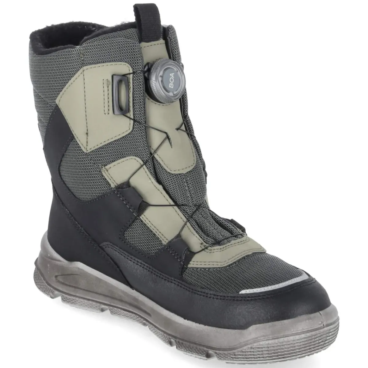 Die Snowboots MARS von Superfit begleiten winterliche Abenteuer mit verlässlichem Komfort. Der wasserfeste Material-Mix aus Textil und Synthetik schützt zusammen mit GORE-TEX zuverlässig vor Nässe, während das kuschelige Warm- und Teddyfutter für ein angenehmes Klima sorgt. Die runde Schuhspitze bietet Zehenfreiheit, ein verstärkter Fußrahmen und der gepolsterte Schaft unterstützen stabilen Halt. Dank BOA-Drehverschluss gelingt das An- und Ausziehen spielend, die rutschfeste Profilsohle greift sicher auf glatten Wegen. Reflektierende Elemente am Zehenbereich und an der Anziehlasche erhöhen die Sichtbarkeit in der Dämmerung. Die textile Decksohle trägt sich weich, die Passform fällt normal aus. Modetipp: Zur grünen Farbe harmonieren Schneehosen in Dunkelblau oder Anthrazit und eine grobgestrickte Mütze in Creme für einen frischen, urbanen Winter-Look.