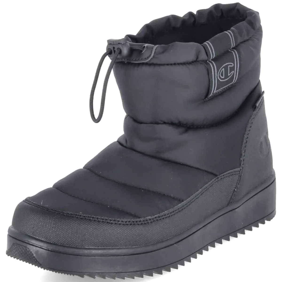 Der Moonboots MONTANA G von Champion in klassischem Schwarz überzeugt mit einem wasserfesten Material-Mix aus Textil und Synthetik, der bei Nässe zuverlässig schützt. Warmfutter umschließt den Fuß und hält auch an kalten Tagen angenehm warm. Die runde Spitze und der verstärkte Fußrahmen sorgen für bequemen Sitz und zusätzliche Stabilität, während die rutschfeste Laufsohle sicheren Halt auf glatten Untergründen bietet. Das Schnürsystem mit flexiblem Schnellverschluss erleichtert das An- und Ausziehen und lässt sich präzise anpassen. Eine textile Decksohle und das herausnehmbare Wechselfußbett erhöhen den Tragekomfort und ermöglichen individuelle Einlagen. Der Schuh fällt normal aus und fügt sich mit moderner Optik mühelos in winterliche Alltags- und Outdoor-Looks ein. Modetipp: Ton-in-Ton mit einer mattschwarzen Pufferjacke und grob gestrickter Mütze wirkt der Auftritt besonders stimmig.