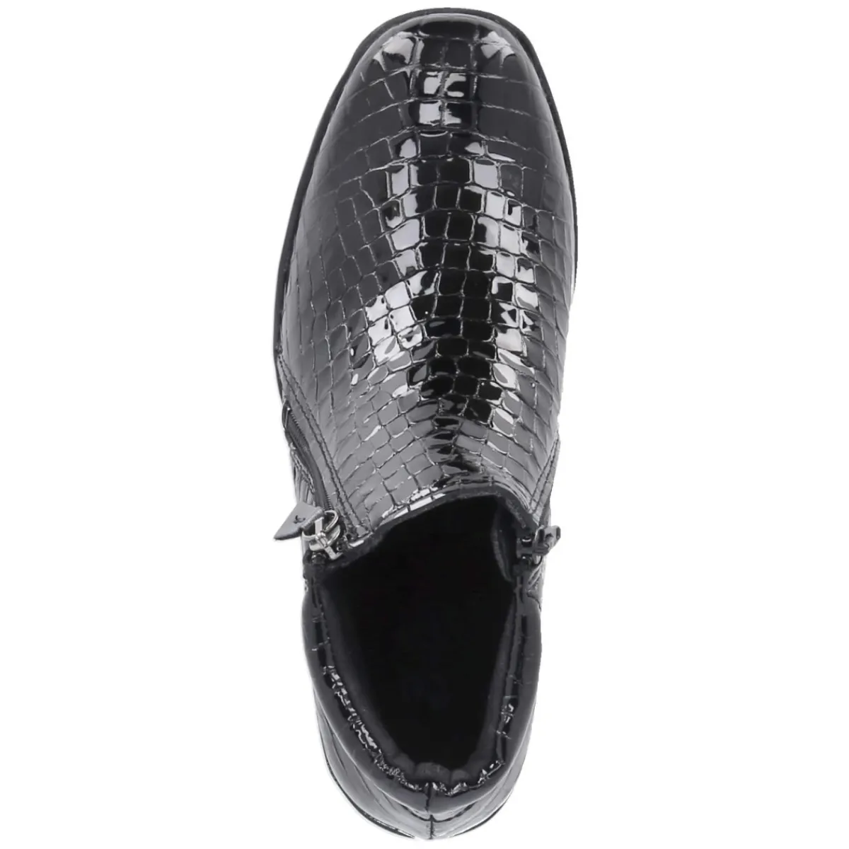 Beliana präsentiert mit den Stiefeletten LEXI 99 einen eleganten Allrounder für Damen, der den urbanen Look mit Komfort verbindet. Das Obermaterial aus schwarzem Lackleder zeigt eine edle Glanzoptik, die durch das dezente Reptilmuster modern akzentuiert wird. Eine runde Schuhspitze und das geringe Gewicht sorgen für angenehmes Tragegefühl im Alltag. Praktische Reißverschlüsse erleichtern den Einstieg, der zusätzlich weich gepolstert ist. Die verstärkte Ferse bietet Stabilität, während die sehr flexible, rutschfeste Laufsohle sicheren Halt gibt. Innen punktet eine textile Decksohle und ein herausnehmbares Wechselfußbett, ideal für eigene Einlagen. Der Schnitt fällt größengetreu aus und richtet sich an Erwachsene, die Wert auf Stil und Funktion legen. Modetipp: Mit schmaler Anzughose in Cropped-Länge und einem feinen Strickrolli entsteht ein cleaner, glänzender City-Look, der tagsüber und abends überzeugt.