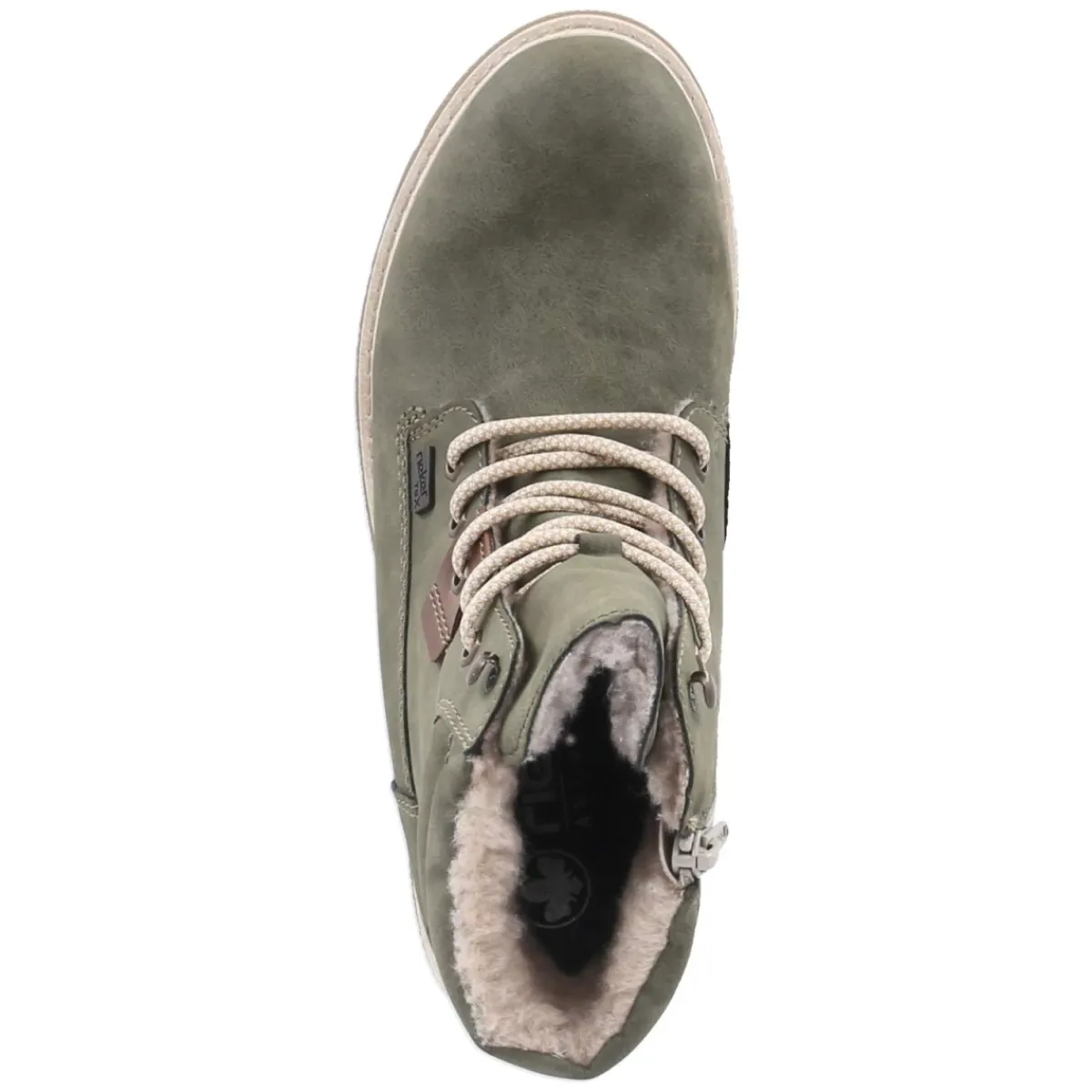 Diese Winterboots von Rieker vereinen Komfort und Stil für kalte Tage. Das grüne Obermaterial aus Synthetik zeigt einen natürlichen Look und wirkt dank wasserabweisender, atmungsaktiver Eigenschaften angenehm bei wechselhaftem Wetter. Warmfutter mit softem Teddyfutter umschließt den Fuß, der gepolsterte Einstieg mit feiner Querstepp-Struktur erhöht den Tragekomfort. Ein 4,5 cm hoher Blockabsatz bietet stabilen Halt, die rutschfeste Profilsohle sorgt für Grip auf glatten Wegen. Runde Schuhspitze, Schnürung plus Klettverschluss und eine textile Decksohle runden das Tragegefühl ab. Das gepolsterte Wechselfußbett lässt sich bei Bedarf gegen eigene Einlagen tauschen. Die Passform fällt schmaler aus; häufig passt eine Nummer größer besser. Modetipp: Ton-in-Ton zur satten Grünnuance wirken ein cremefarbener Strickpullover, Wollmantel in Camel und grobe Wollsocken besonders harmonisch.
