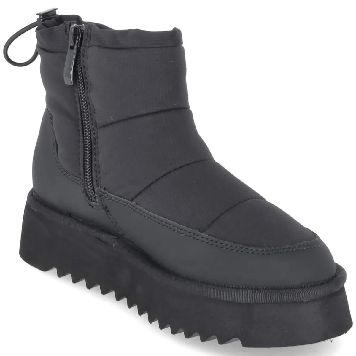 Die Tamaris Winterboots in Schwarz verbinden retroinspiriertes Snowboot-Design mit zeitgemäßem Komfort. Die matte Quersteppoberfläche trifft auf einen weichen Schaft mit Gummizug und Schnellverschluss, während der seitliche Reißverschluss ein müheloses Hineinschlüpfen ermöglicht. Warmfutter und eine textile Decksohle umhüllen den Fuß angenehm, der verstärkte Fußrahmen gibt Stabilität im Alltag. Die runde Spitze und das Obermaterial aus Textil und Synthetik sorgen für ein angenehmes Tragegefühl, die pflegeleichte Oberfläche erleichtert die Handhabung. Mit 3,5 cm Plateauhöhe und einer dicken, leichten Sohle entsteht ein moderner Look, der zugleich Schutz vor Bodenkälte bietet. Der Schnitt fällt normal aus und eignet sich für vielfältige Winter-Outfits. Modetipp: Mit Pufferjacke, gerippten Wollstrümpfen und verkürzter Straight-Leg-Jeans entsteht ein urbane Silhouette, die das voluminöse Schaftdesign souverän ausbalanciert.