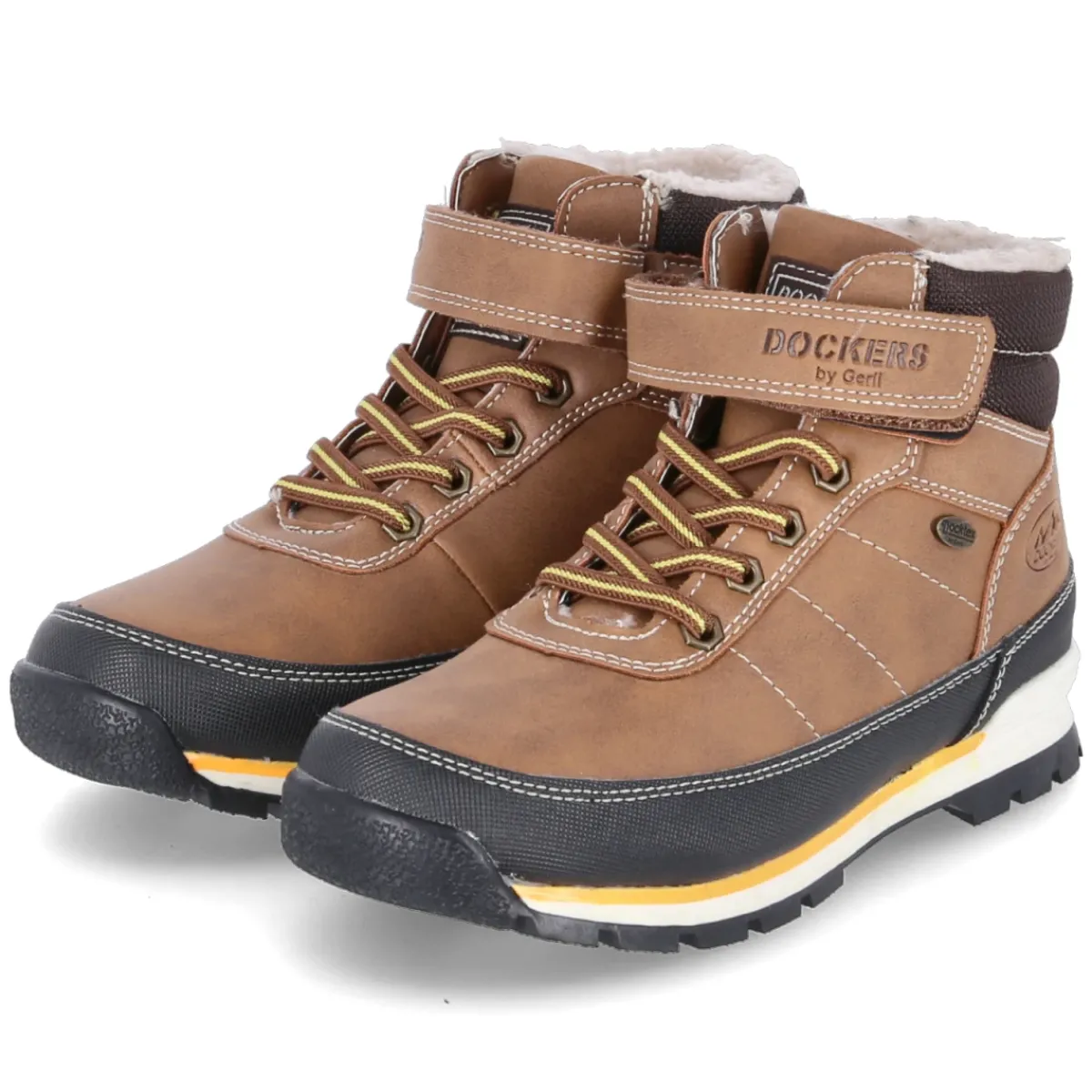 Diese Winterboots von Dockers begleiten Grundschulkinder sicher durch kalte Tage. Das braune Obermaterial aus robustem Kunstleder trotzt dank wasserfester und winddichter Verarbeitung Schnee und Niesel, während das isolierende Warmfutter mit kuscheligem Teddyfell verlässlich wärmt. Eine textile Decksohle und der gepolsterte Einstieg sorgen für angenehmen Tragekomfort, der verstärkte Fußrahmen erhöht die Stabilität. Der bequeme Klettverschluss mit Elastikband in Schnüroptik erleichtert das An- und Ausziehen, die rutschhemmende, flexible Profillaufsohle gibt Halt auf glatten Wegen. Mit runder Schuhspitze und normaler Passform eignet sich das Modell ideal für den Schulweg und aktive Pausen. Modetipp: Zu Thermojeans, grob gestrickten Wollsocken und einem Parka in Waldgrün entsteht ein lässiger Winterlook.