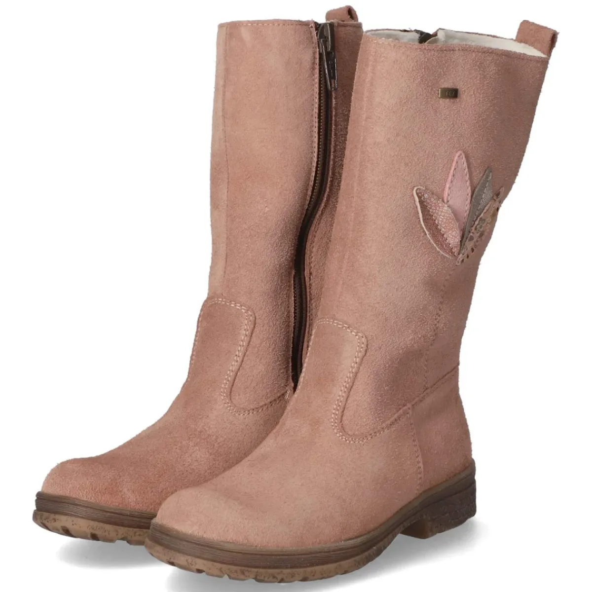 Dieser Winterstiefel von Däumling begleitet kleine Füße warm und trocken durch kalte Tage. Das sehr weiche Rauleder in zartem Rosa zeigt ein hübsches Blumenmotiv und wird von einem stabilen Blockabsatz mit 2,5 cm Höhe und einer flexiblen, rutschhemmenden Profilsohle sicher getragen. Dank wasserfestem und atmungsaktivem TEX-Material bleiben die Füße geschützt, während warmes Textilfutter und eine gepolsterte, entnehmbare Wechseldecksohle für behaglichen Komfort sorgen. Der bequeme Reißverschlusseinstieg mit Anziehlasche erleichtert das An- und Ausziehen, der Schaft misst ca. 23 cm in der Höhe und 22 cm im Umfang. Runde Schuhspitze sowie verstärkter Zehen- und Fersenbereich geben zusätzlichen Halt, die Passform fällt normal aus. Modetipp: Zu Strickleggings und Parka in Creme entsteht ein sanfter Winterlook, den ein roséfarbener Schal harmonisch aufgreift.