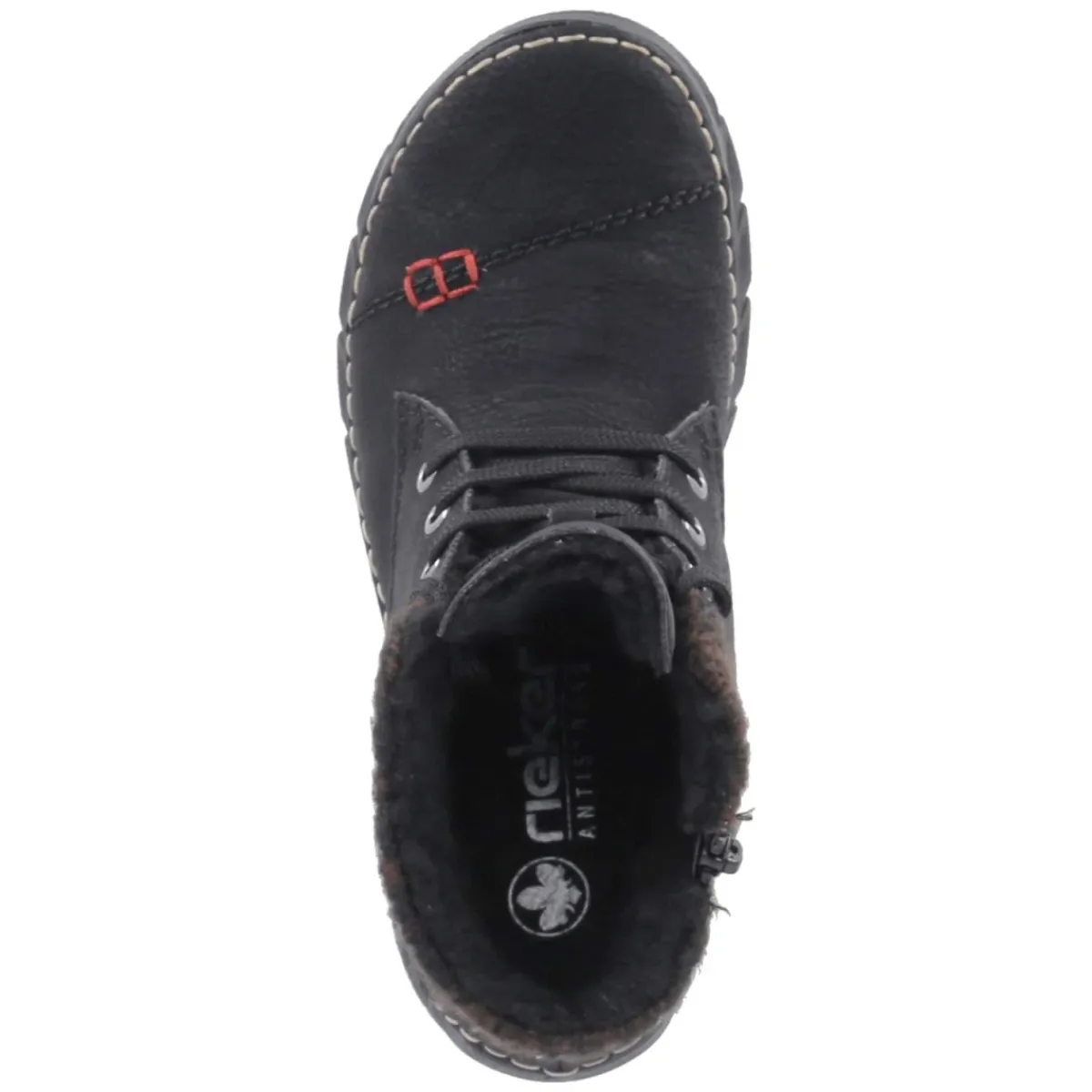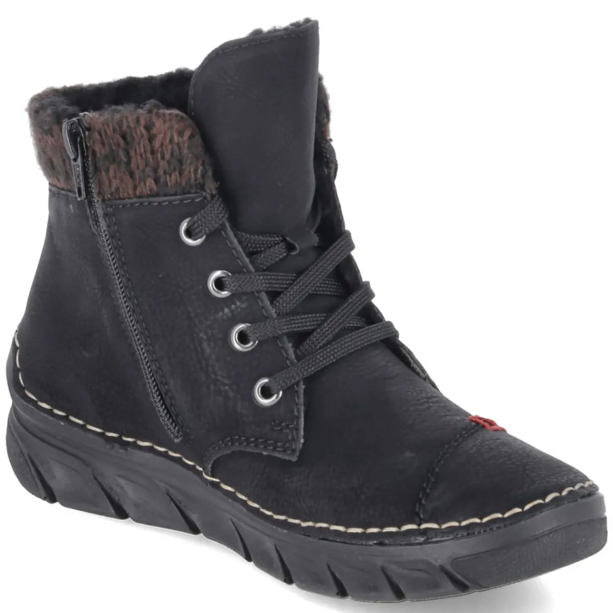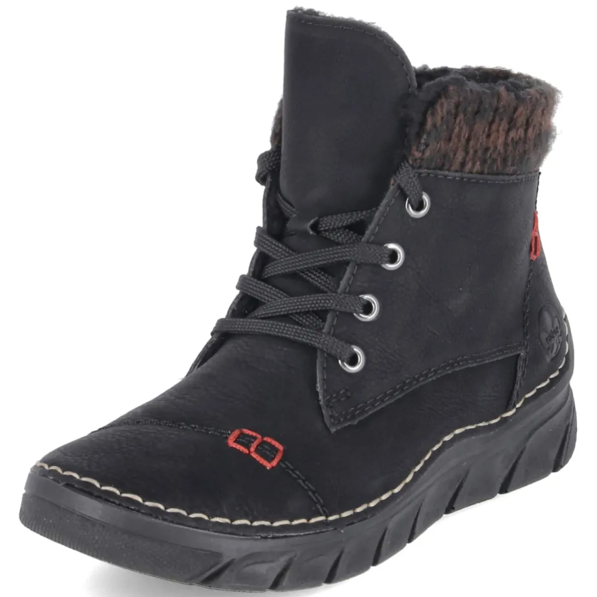 Die Winterstiefeletten von Rieker verbinden Wärme, Leichtigkeit und Alltagstauglichkeit in einem klaren, schwarzen Design. Das pflegeleichte Synthetik-Obermaterial trotzt Schneematsch und Spritzwasser, während das warme Futter und die textilbezogene Decksohle für behagliches Klima an kalten Tagen sorgen. Durch die Kombination aus Schnürung und seitlichem Reißverschluss gelingt der Einstieg besonders komfortabel; der weiche Strick-Einstieg schmiegt sich angenehm an. Ein relaxtes Leichtgewicht-Feeling begleitet jeden Schritt, unterstützt von einem gut gepolsterten Fußbett und einer flexiblen, rutschfesten Laufsohle für sicheren Halt. Die runde Schuhspitze und dezente Markendetails bringen eine feminine, zeitlose Note ein. Der Größenhinweis fällt normal aus und erleichtert die Auswahl. Modetipp: Besonders stimmig zu schmalen Jeans, Grobstrickpullover und Wollmantel; ein Schal in sattem Burgunder setzt einen edlen Akzent.
