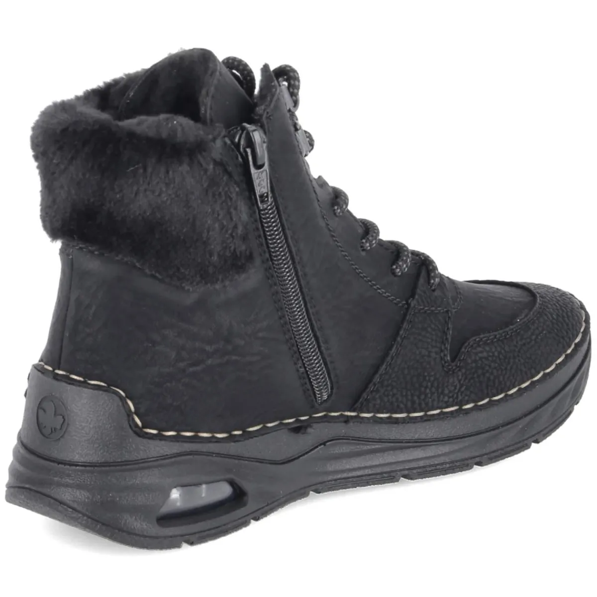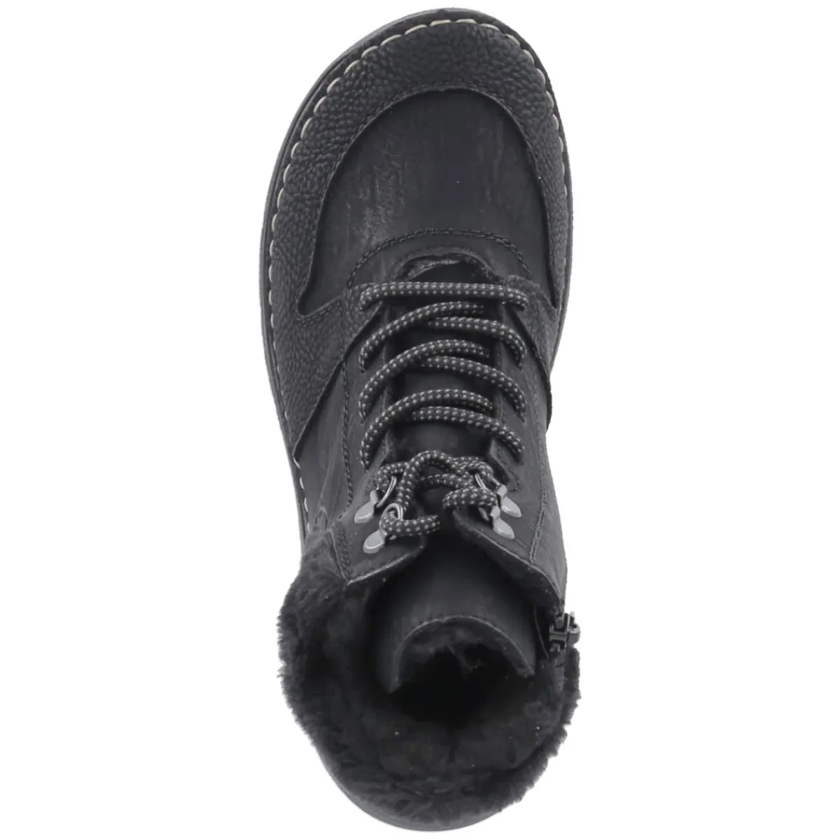 Diese Winterstiefeletten von Rieker verbinden sportliche Optik mit hohem Tragekomfort. Das pflegeleichte Obermaterial aus Synthetik zeigt sich in klassischem Schwarz und wird von einer runden Spitze sowie der Kombination aus Schnürsenkeln und Reißverschluss ergänzt, was den Einstieg erleichtert. Innen sorgt Warmfutter für ein gemütliches Klima an kalten Tagen, die textile Decksohle und das gut gepolsterte Fußbett unterstützen angenehm bei jedem Schritt. Ein gepolsterter Schaftrand mit Kunstfellkrempe umschmeichelt den Knöchel, während verstärkte Fersen- und Zehenbereiche zusätzliche Stabilität geben. Die flexible, rutschfeste Laufsohle mit Sichtfenster in der Ferse bietet verlässlichen Grip auf winterlichen Wegen. Der Schnitt fällt normal aus und passt sich dem Alltag stilvoll an. Modetipp: Mit schwarzer Skinny-Jeans, grobem Strickpullover und gestepptem Mantel entsteht ein harmonischer City-Look.