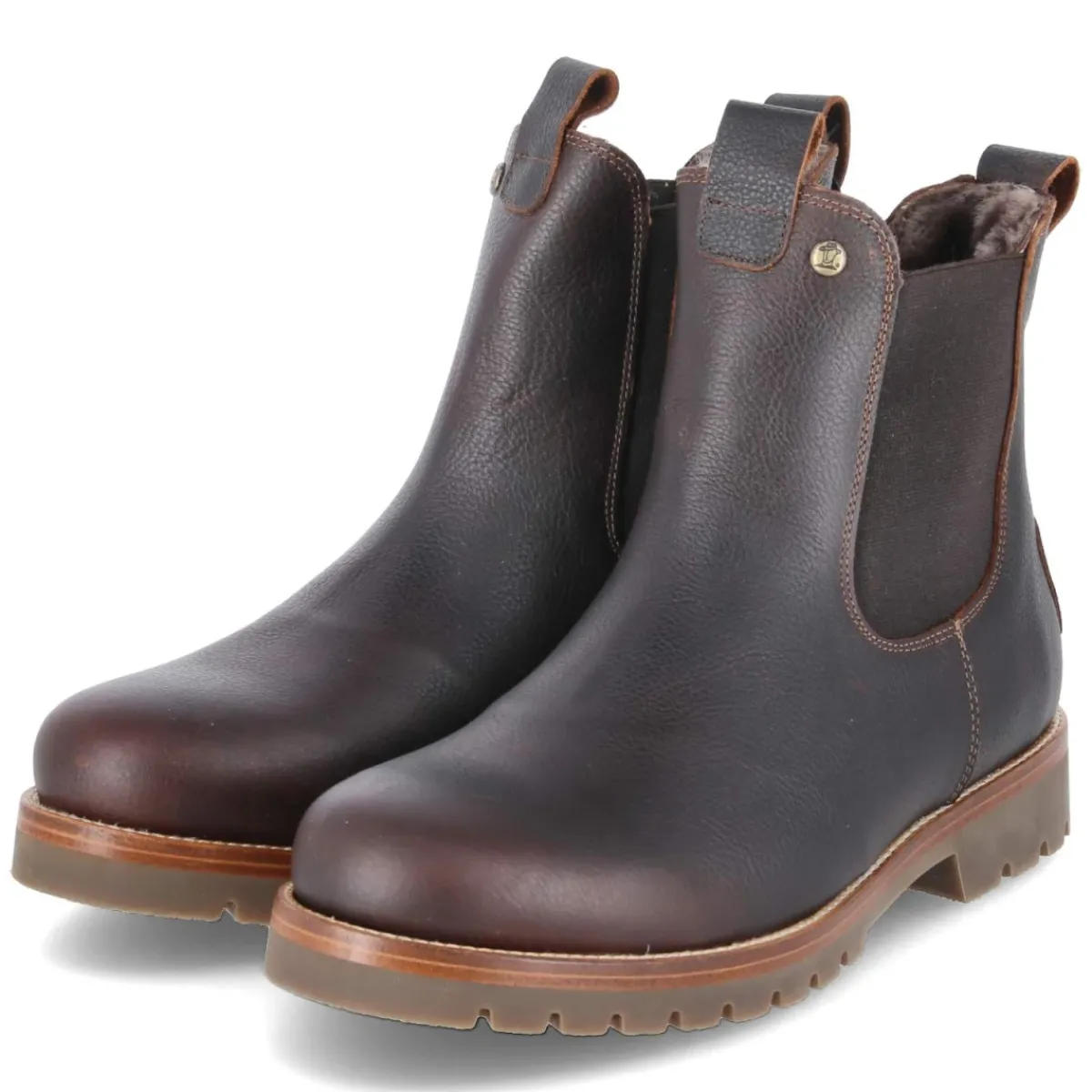 Der Herren-Chelsea Boot BENY IGLOO C 2 von Panama Jack verbindet markante Optik mit wetterfestem Komfort. Das braune Glattleder mit wasserfestem Finish schützt zuverlässig, während warmes Lammfellfutter und Lederdecksohle ein angenehm trockenes Fußklima schaffen. Zwei große Elastikeinsätze, ein seitlicher Reißverschluss und Anziehlaschen erleichtern den Einstieg, der verstärkte Fersenbereich sorgt für Halt. Der 4 cm hohe Blockabsatz und die flexible, rutschfeste Laufsohle bieten Stabilität auf nassen Wegen. Die runde Kappe und das Wechselfußbett unterstützen komfortable Passform; der Schuh fällt normal aus und lässt sich vielfältig kombinieren. Modetipp: Mit Raw-Denim, grobem Strick und einem dunkelblauen Wollmantel entsteht ein urbaner Winterlook mit klassischer Note.